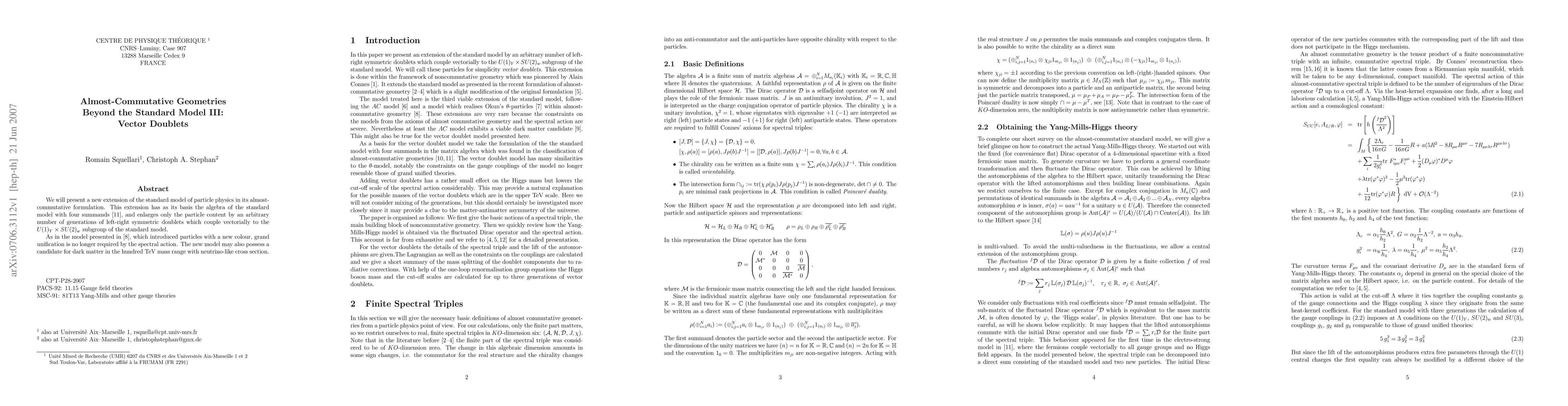 We will present a new extension of the standard model of particle physics in its almostcommutative formulation. This extension has as its basis the algebra of the standard model with four summands [11], and enlarges only the particle content by an arbitrary number of generations of left-right symmetric doublets which couple vectorially to the U(1)_YxSU(2)_w subgroup of the standard model. As in the model presented in [8], which introduced particles with a new colour, grand unification is no longer required by the spectral action. The new model may also possess a candidate for dark matter in the hundred TeV mass range with neutrino-like cross section.