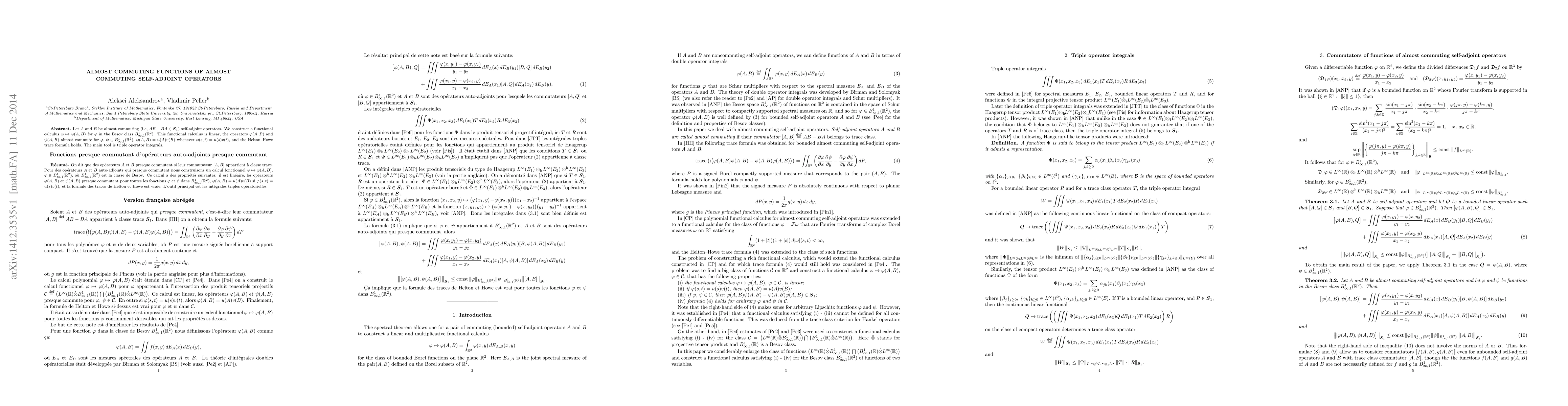 Let $A$ and $B$ be almost commuting (i.e, $AB-BA\in\bS_1$) self-adjoint operators. We construct a functional calculus $\f\mapsto\f(A,B)$ for $\f$ in the Besov class $B_{\be,1}^1(\R^2)$. This functional calculus is linear, the operators $\f(A,B)$ and $\psi(A,B)$ almost commute for $\f,\,\psi\in B_{\be,1}^1(\R^2)$, $\f(A,B)=u(A)v(B)$ whenever $\f(s,t)=u(s)v(t)$, and the Helton--Howe trace formula holds. The main tool is triple operator integrals.