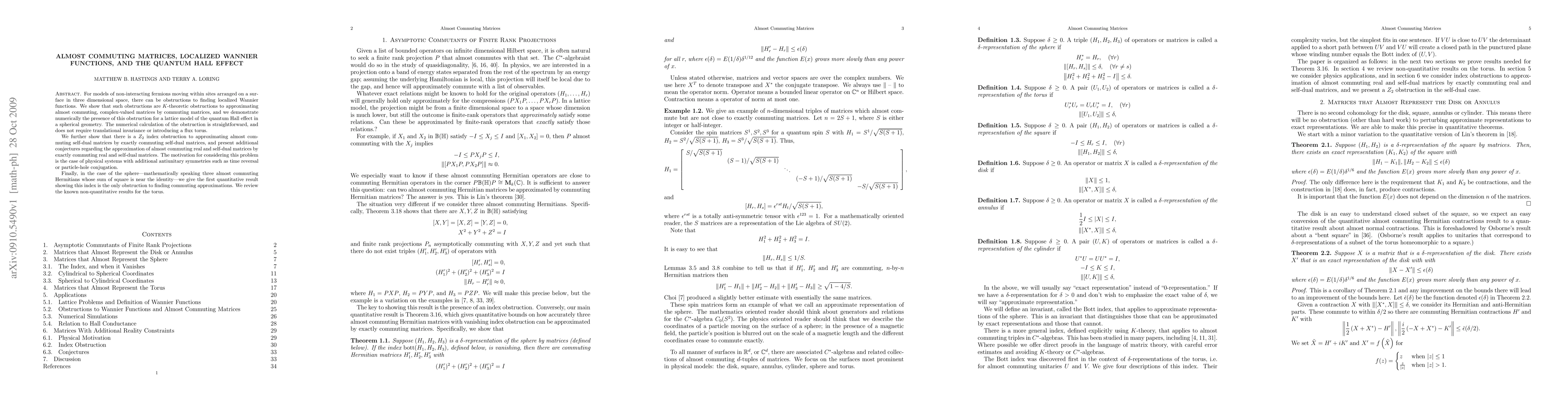 For models of non-interacting fermions moving within sites arranged on a surface in three dimensional space, there can be obstructions to finding localized Wannier functions. We show that such obstructions are $K$-theoretic obstructions to approximating almost commuting, complex-valued matrices by commuting matrices, and we demonstrate numerically the presence of this obstruction for a lattice model of the quantum Hall effect in a spherical geometry. The numerical calculation of the obstruction is straightforward, and does not require translational invariance or introducing a flux torus. We further show that there is a $Z_2$ index obstruction to approximating almost commuting self-dual matrices by exactly commuting self-dual matrices, and present additional conjectures regarding the approximation of almost commuting real and self-dual matrices by exactly commuting real and self-dual matrices. The motivation for considering this problem is the case of physical systems with additional antiunitary symmetries such as time reversal or particle-hole conjugation. Finally, in the case of the sphere--mathematically speaking three almost commuting Hermitians whose sum of square is near the identity--we give the first quantitative result showing this index is the only obstruction to finding commuting approximations. We review the known non-quantitative results for the torus.