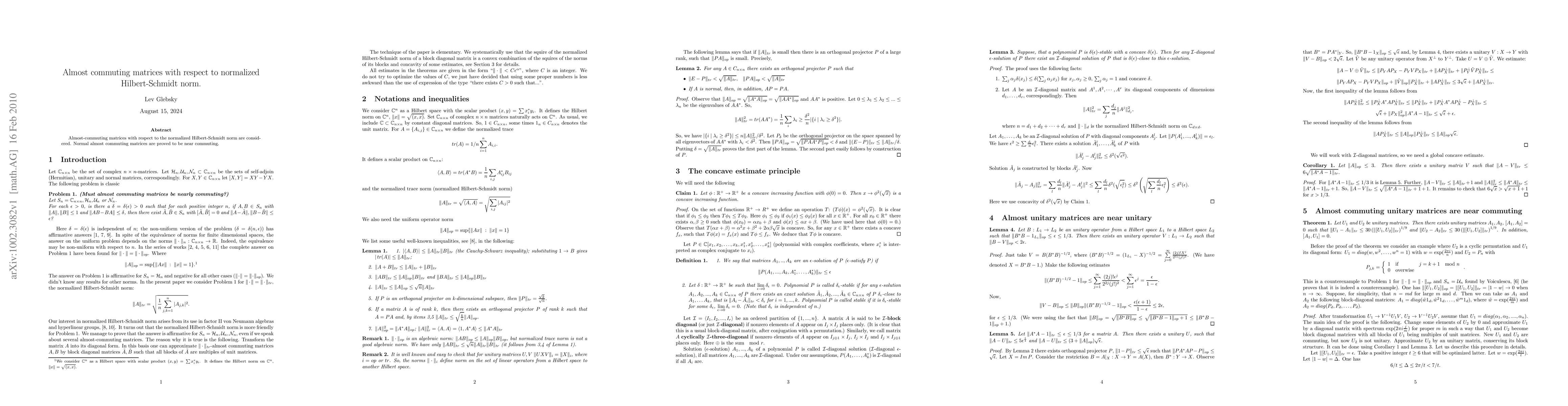 Summary: This paper explores the concept of almost commuting matrices in relation to the normalized Hilbert-Schmidt norm, proving that normal almost commuting matrices are essentially close to commuting.