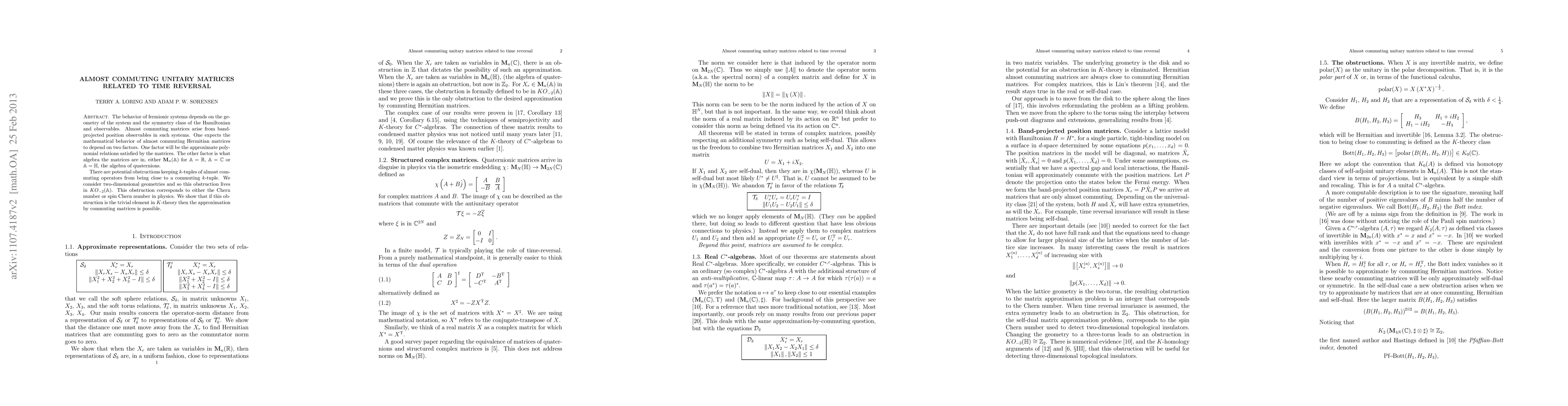 This paper investigates almost commuting unitary matrices related to time reversal in fermionic systems, focusing on how the geometry and symmetry of the Hamiltonian affect their behavior. It reveals that the feasibility of approximating these matrices by commuting ones depends on the algebraic structure and the triviality of the obstruction in K-theory, which corresponds to the Chern number or spin Chern number in physics.