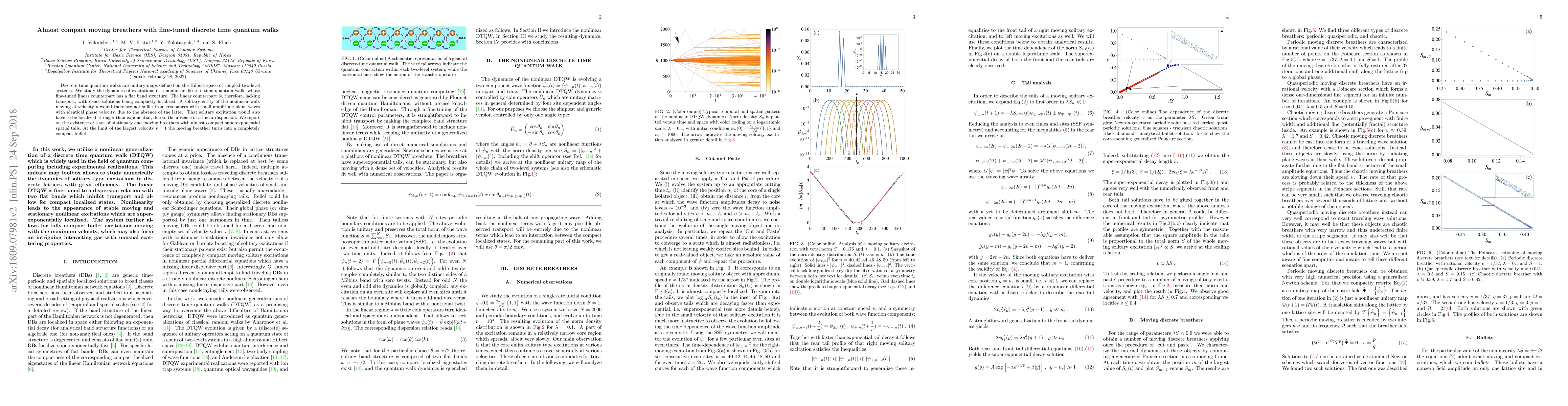 The paper investigates nonlinear discrete time quantum walks where solitary excitations exhibit almost compact, superexponentially localized spatial tails, avoiding resonances with small amplitude plane waves due to the absence of linear dispersion. At maximum velocity, these excitations transform into fully compact "bullets."