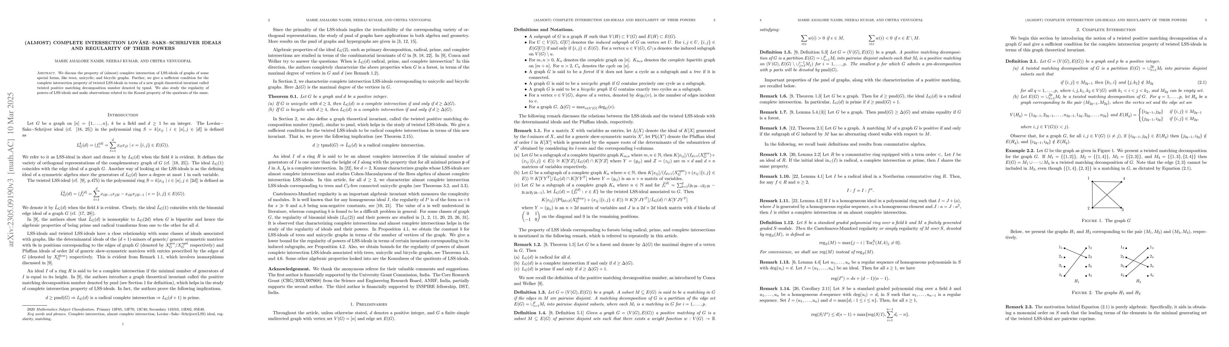 Summary: This paper examines (almost) complete intersection properties of Lovász-Saks-Schrijver (LSS) ideals associated with specific graph types and introduces a new invariant, tpmd, for determining the complete intersection property of twisted LSS-ideals. Additionally, it investigates the regularity of powers of these ideals and their connection to the Koszul property.