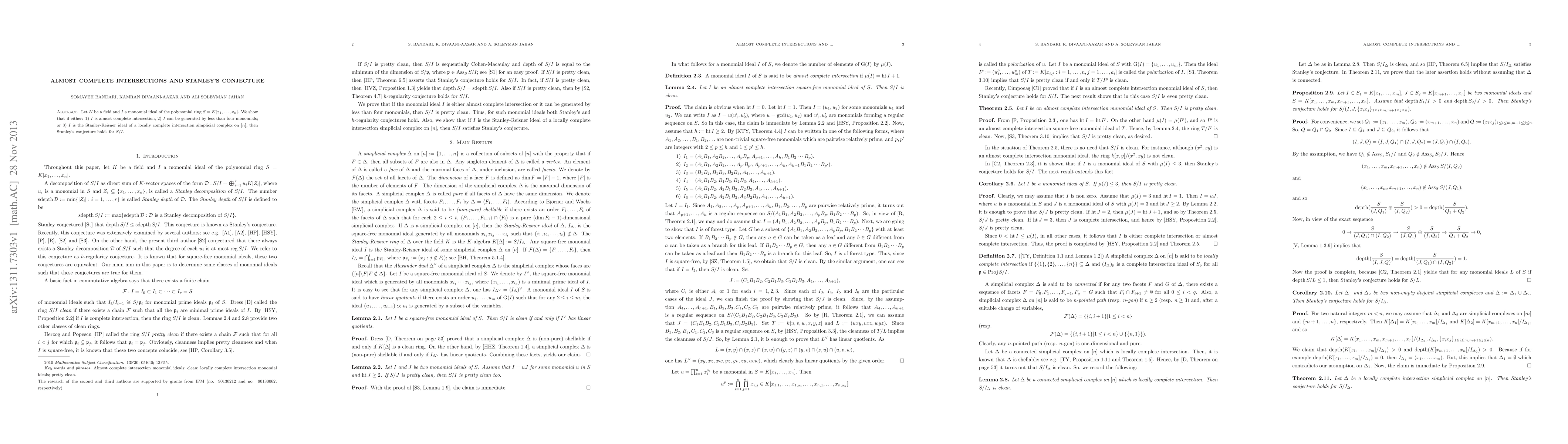 This paper proves Stanley's conjecture for $S/I$ when $I$ is an almost complete intersection, can be generated by fewer than four monomials, or is a Stanley-Reisner ideal of a locally complete intersection simplicial complex.
