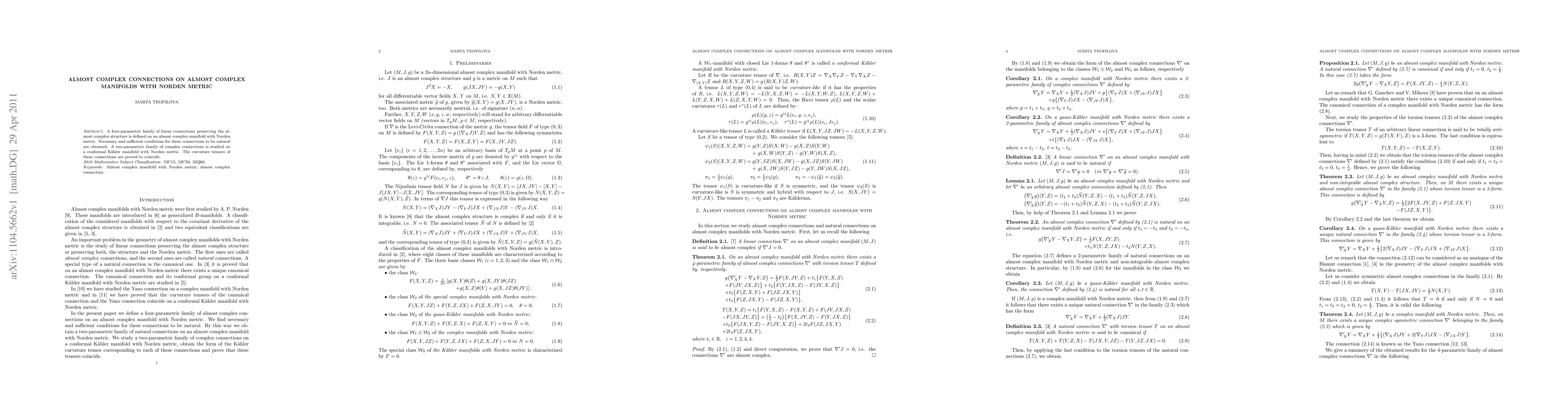 This paper defines a four-parametric family of linear connections on almost complex manifolds with Norden metric that preserve the almost complex structure and derives conditions for these connections to be natural. It also examines a two-parametric family of complex connections on conformal Kähler manifolds with Norden metric, proving their curvature tensors coincide.