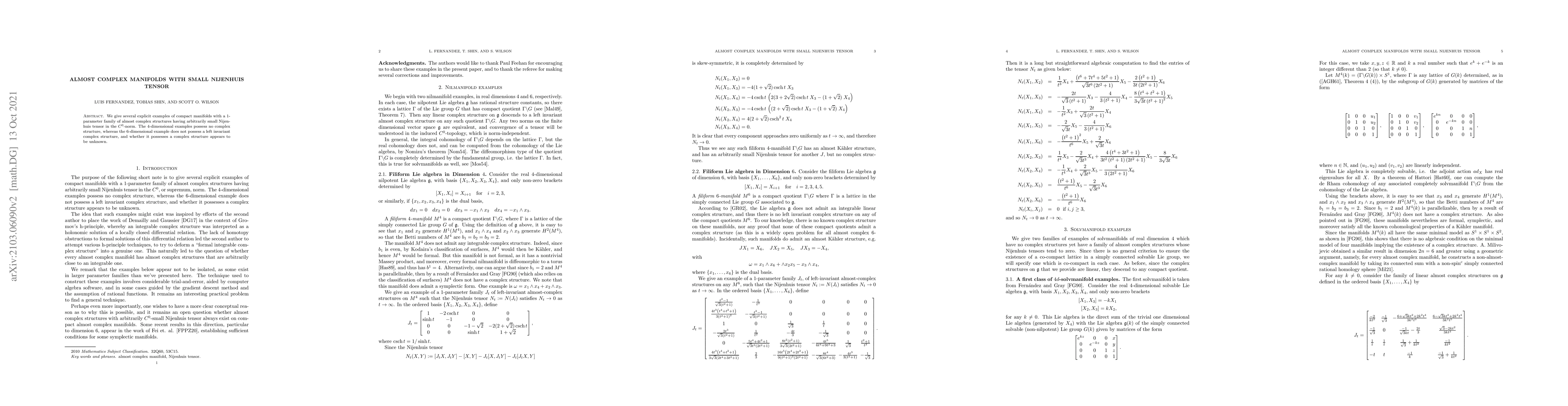 Researchers have found compact manifolds with almost complex structures having small Nijenhuis tensor values, with some examples lacking a complex structure or left-invariant one.