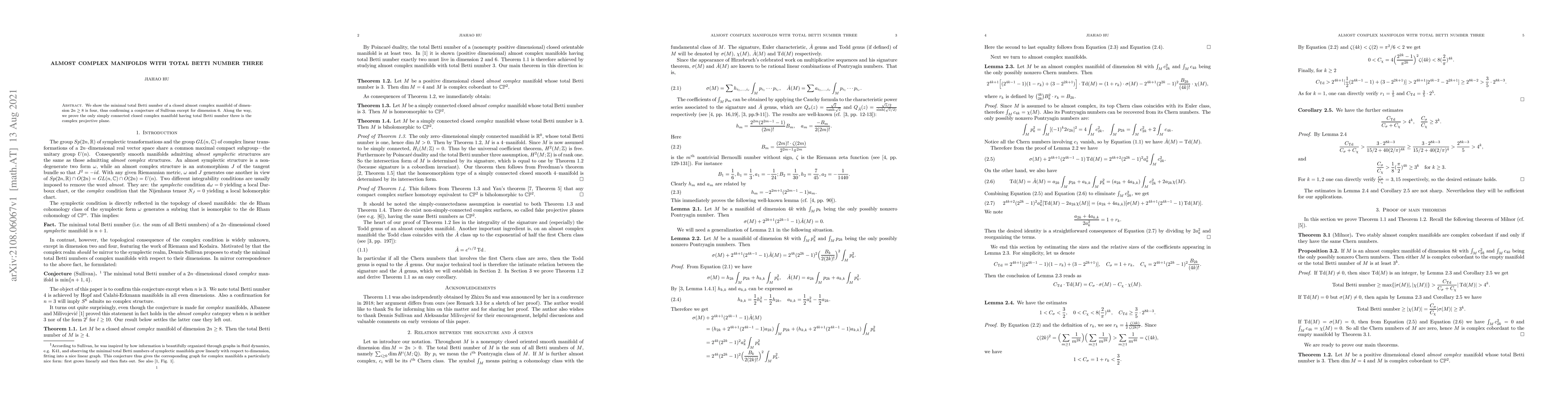 Summary: The paper confirms that the minimal total Betti number for closed almost complex manifolds of dimension $2n \geq 8$ is four, with an exception in dimension six, and identifies the complex projective plane as the only simply connected closed complex manifold with a total Betti number of three.