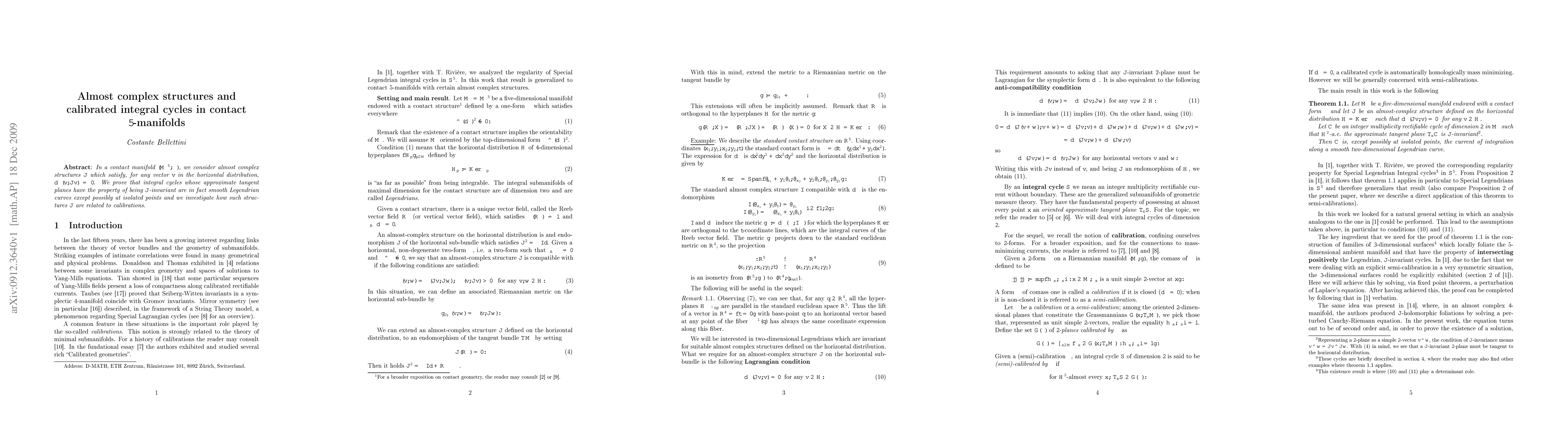 Research investigates integral cycles in contact 5-manifolds with specific almost complex structure properties, revealing their relation to calibrations and smooth Legendrian curves.
