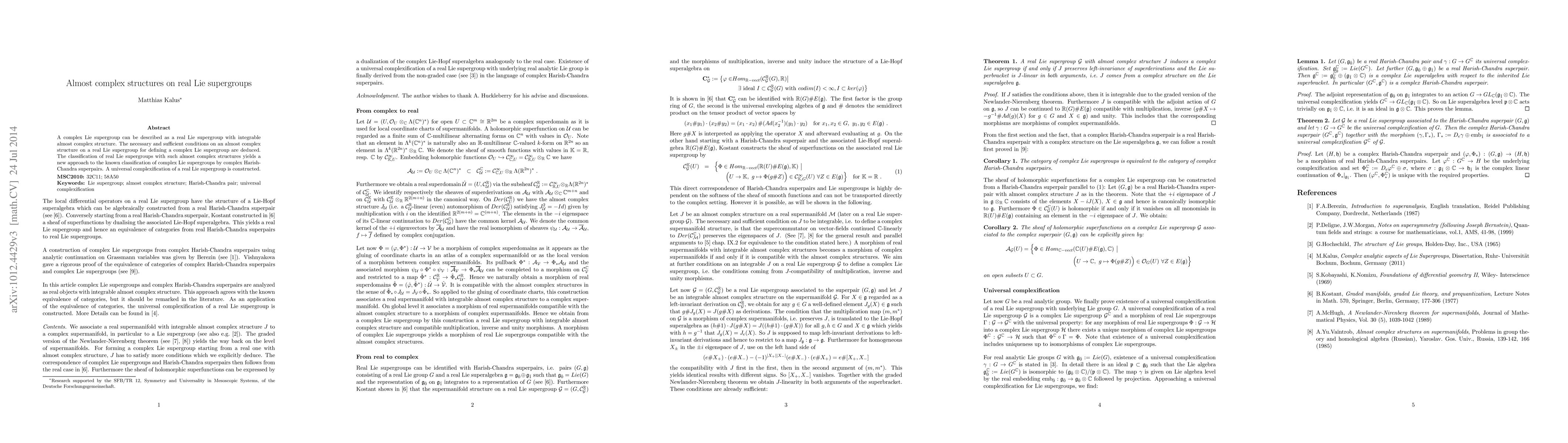 The paper deduces conditions for an almost complex structure on a real Lie supergroup to define a complex Lie supergroup and constructs a universal complexification, offering a new classification approach based on complex Harish-Chandra superpairs.