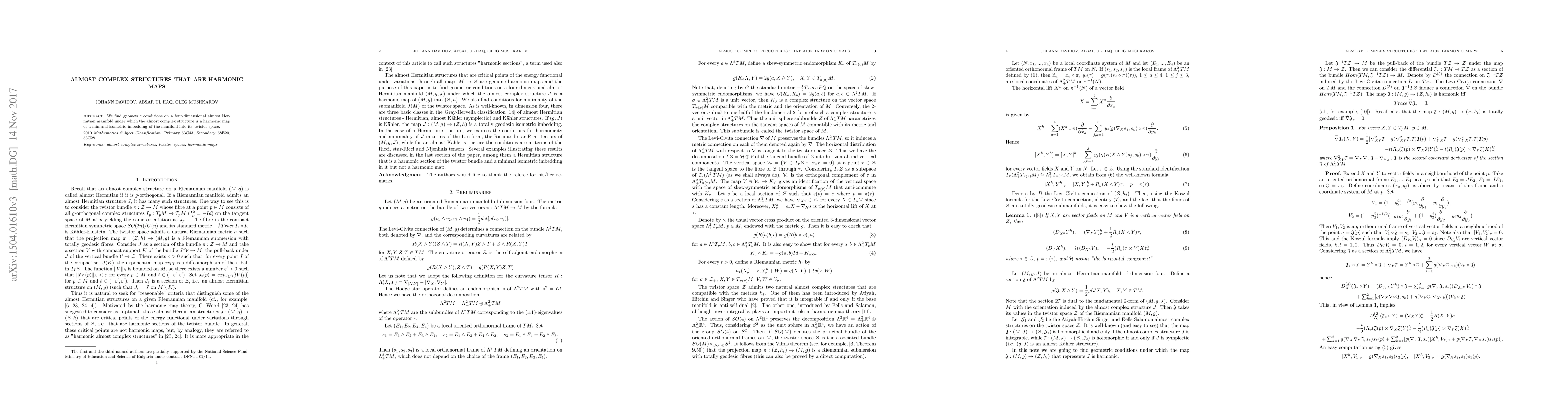 Researchers found conditions on a four-dimensional almost Hermitian manifold that make its complex structure a harmonic map or minimal isometric embedding into its twistor space.