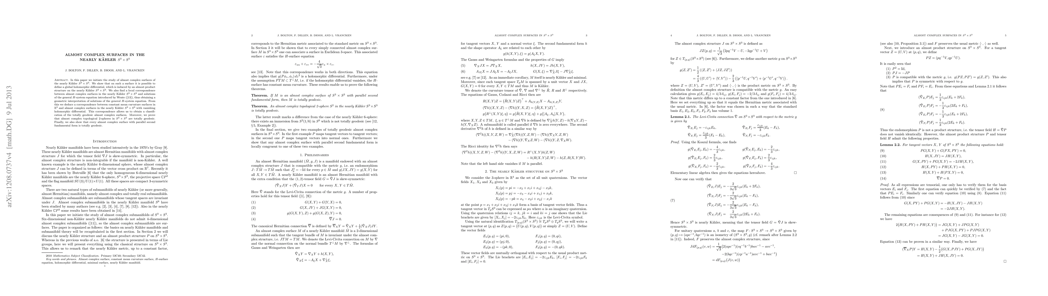 This paper systematically studies almost complex surfaces within the nearly Kähler $S^3\times S^3$, revealing a global holomorphic differential and a correspondence with solutions of the general $H$-system equation. It also classifies totally geodesic almost complex surfaces and proves that almost complex topological 2-spheres are totally geodesic.
