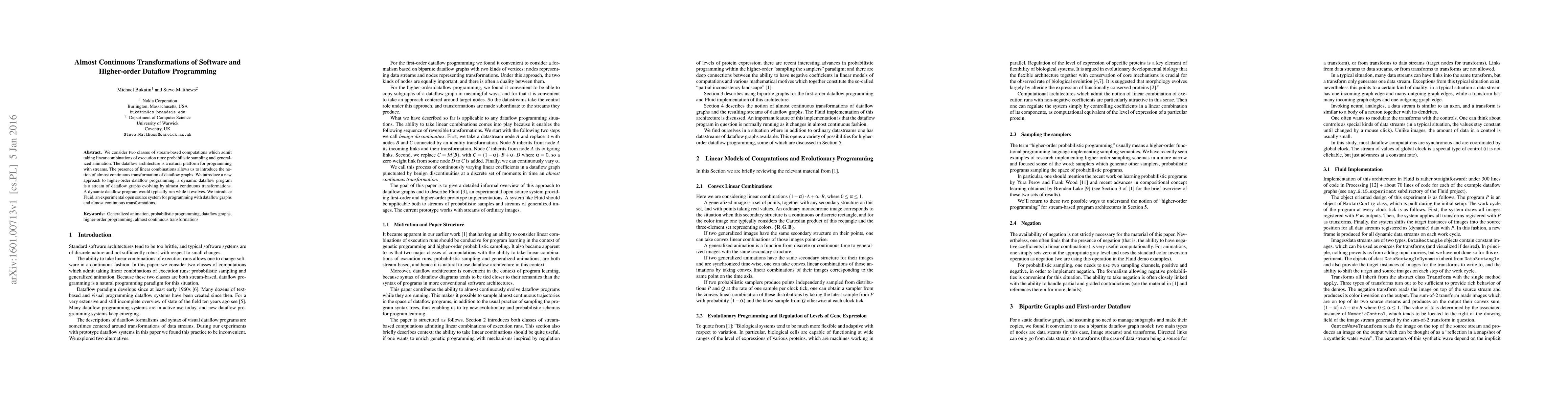 We consider two classes of stream-based computations which admit taking linear combinations of execution runs: probabilistic sampling and generalized animation. The dataflow architecture is a natural platform for programming with streams. The presence of linear combinations allows us to introduce the notion of almost continuous transformation of dataflow graphs. We introduce a new approach to higher-order dataflow programming: a dynamic dataflow program is a stream of dataflow graphs evolving by almost continuous transformations. A dynamic dataflow program would typically run while it evolves. We introduce Fluid, an experimental open source system for programming with dataflow graphs and almost continuous transformations.