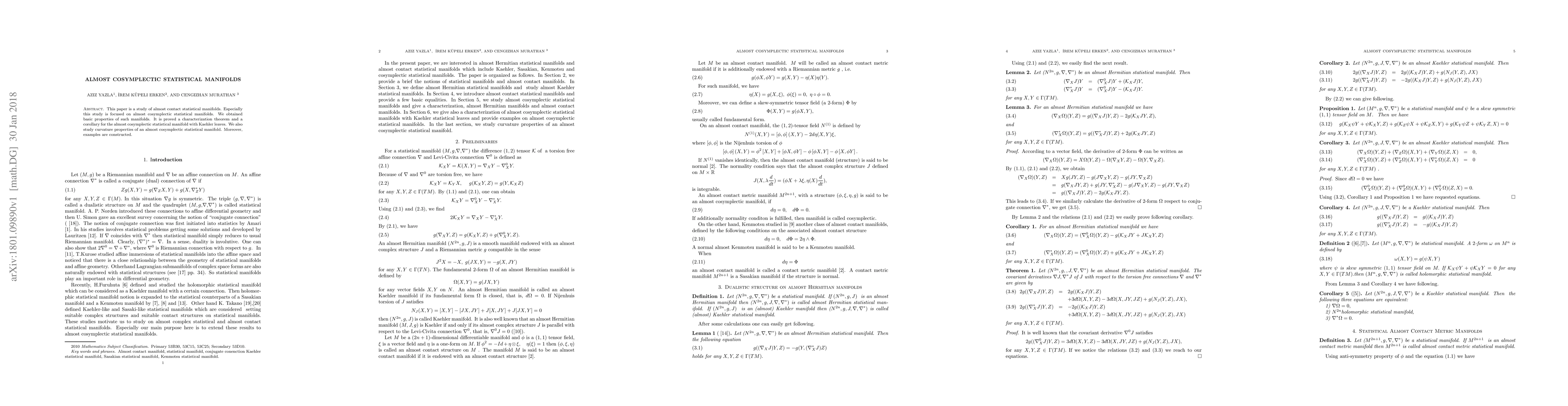 This paper investigates almost cosymplectic statistical manifolds, establishing their fundamental properties, a characterization theorem, and curvature properties. Examples of these manifolds are also provided.