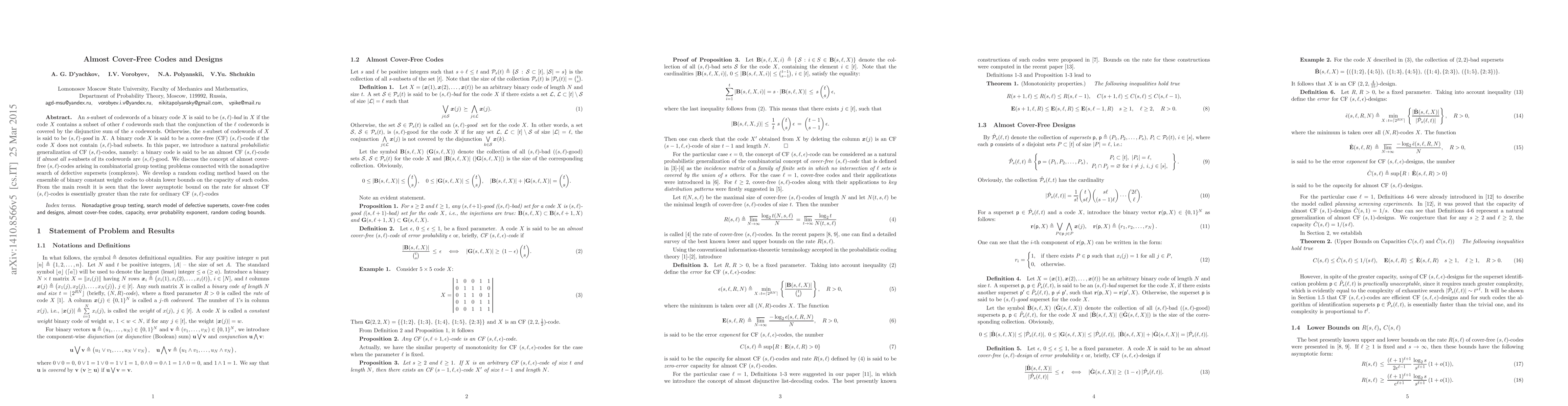 The paper introduces a probabilistic generalization of cover-free (s,ℓ)-codes, called almost cover-free (s,ℓ)-codes, and develops a random coding method using binary constant weight codes to obtain lower bounds on the capacity of such codes.