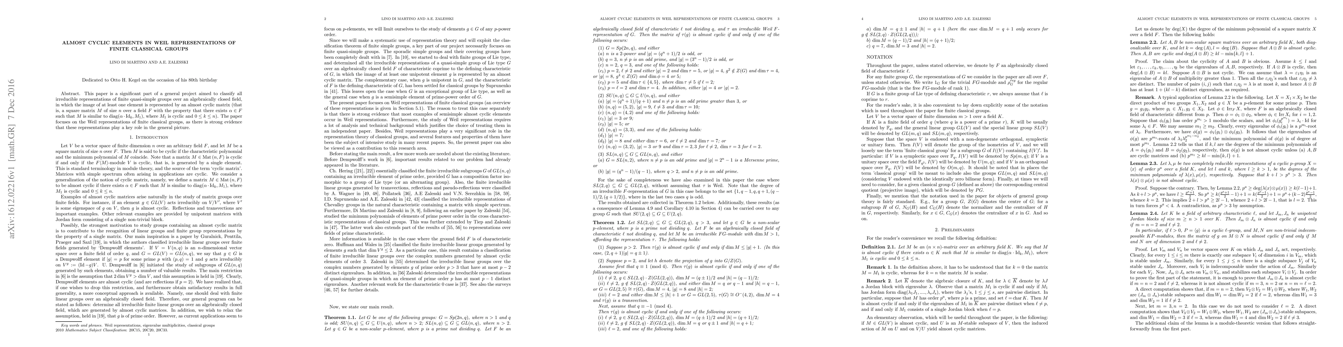 This paper classifies irreducible representations of finite quasi-simple groups where an element's image is an almost cyclic matrix, characterized by its block-diagonal form with scalar and coinciding minimum/characteristic polynomials. It specifically investigates the role of Weil representations of finite classical groups in this classification.