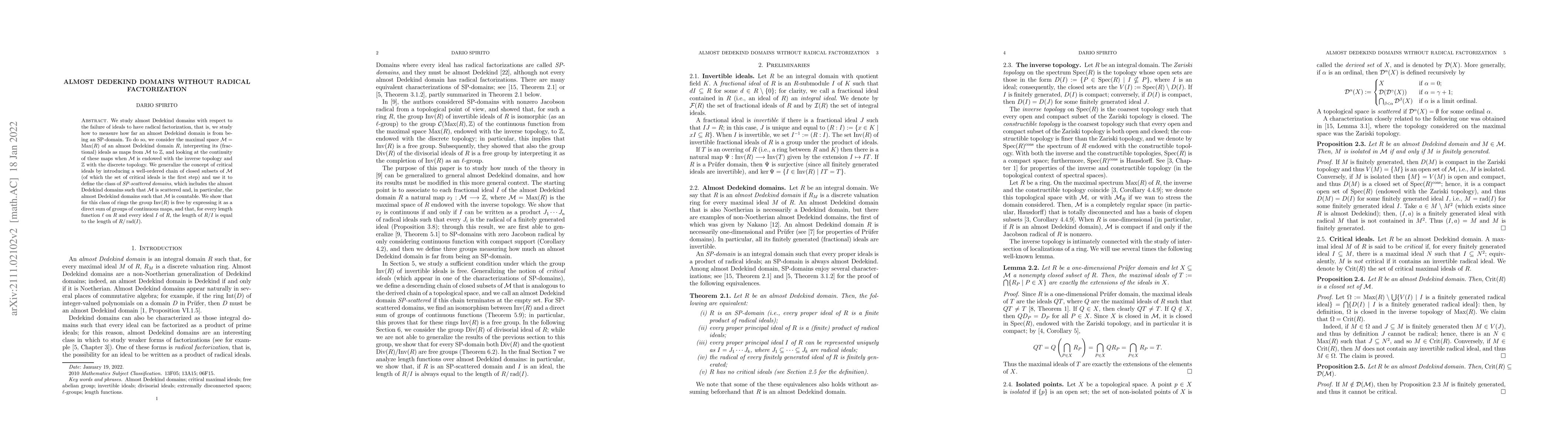 We study almost Dedekind domains with respect to the failure of ideals to have radical factorization, that is, we study how to measure how far an almost Dedekind domain is from being an SP-domain. To do so, we consider the maximal space $\mathcal{M}=\mathrm{Max}(R)$ of an almost Dedekind domain $R$, interpreting its (fractional) ideals as maps from $\mathcal{M}$ to $\mathbb{Z}$, and looking at the continuity of these maps when $\mathcal{M}$ is endowed with the inverse topology and $\mathbb{Z}$ with the discrete topology. We generalize the concept of critical ideals by introducing a well-ordered chain of closed subsets of $\mathcal{M}$ (of which the set of critical ideals is the first step) and use it to define the class of \emph{SP-scattered domains}, which includes the almost Dedekind domains such that $\mathcal{M}$ is scattered and, in particular, the almost Dedekind domains such that $\mathcal{M}$ is countable. We show that for this class of rings the group $\mathrm{Inv}(R)$ is free by expressing it as a direct sum of groups of continuous maps, and that, for every length function $\ell$ on $R$ and every ideal $I$ of $R$, the length of $R/I$ is equal to the length of $R/\mathrm{rad}(I)$.