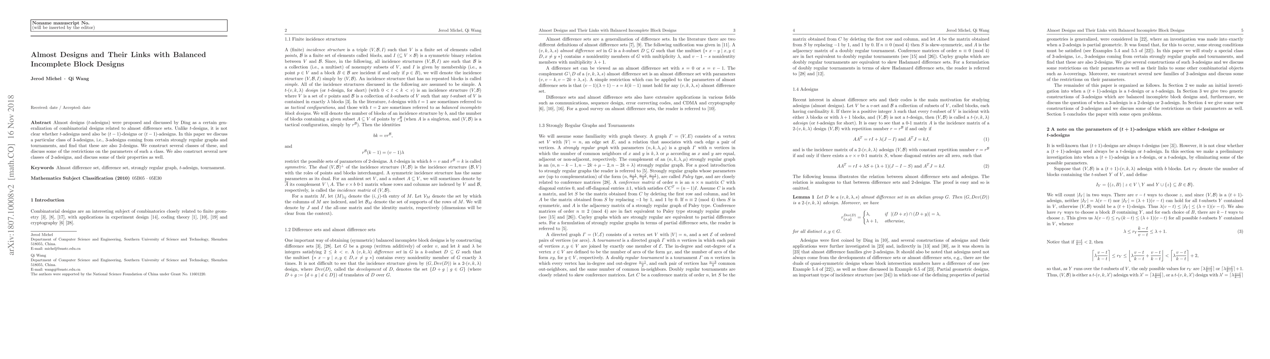 Almost designs ($t$-adesigns) were proposed and discussed by Ding as a certain generalization of combinatorial designs related to almost difference sets. Unlike $t$-designs, it is not clear whether $t$-adesigns need also be $(t-1)$-designs or $(t-1)$-adesigns. In this paper we discuss a particular class of 3-adesigns, i.e., 3-adesigns coming from certain strongly regular graphs and tournaments, and find that these are also $2$-designs. We construct several classes of these, and discuss some of the restrictions on the parameters of such a class. We also construct several new classes of 2-adesigns, and discuss some of their properties as well.