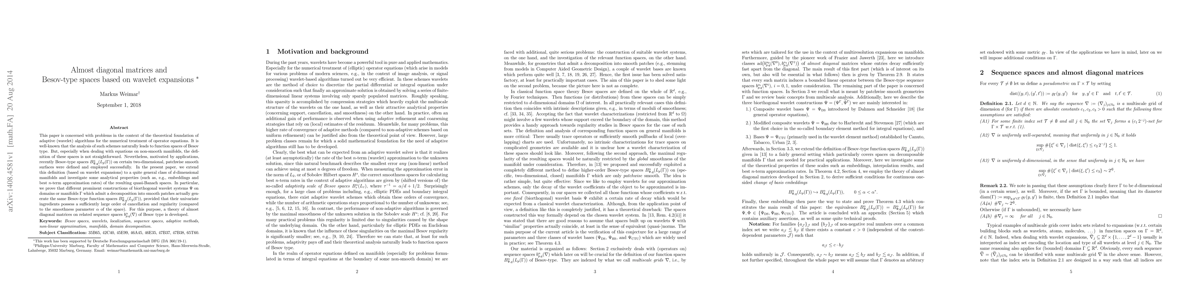This paper is concerned with problems in the context of the theoretical foundation of adaptive (wavelet) algorithms for the numerical treatment of operator equations. It is well-known that the analysis of such schemes naturally leads to function spaces of Besov type. But, especially when dealing with equations on non-smooth manifolds, the definition of these spaces is not straightforward. Nevertheless, motivated by applications, recently Besov-type spaces $B^\alpha_{\Psi,q}(L_p(\Gamma))$ on certain two-dimensional, patchwise smooth surfaces were defined and employed successfully. In the present paper, we extend this definition (based on wavelet expansions) to a quite general class of $d$-dimensional manifolds and investigate some analytical properties (such as, e.g., embeddings and best $n$-term approximation rates) of the resulting quasi-Banach spaces. In particular, we prove that different prominent constructions of biorthogonal wavelet systems $\Psi$ on domains or manifolds $\Gamma$ which admit a decomposition into smooth patches actually generate the same Besov-type function spaces $B^\alpha_{\Psi,q}(L_p(\Gamma))$, provided that their univariate ingredients possess a sufficiently large order of cancellation and regularity (compared to the smoothness parameter $\alpha$ of the space). For this purpose, a theory of almost diagonal matrices on related sequence spaces $b^\alpha_{p,q}(\nabla)$ of Besov type is developed. Keywords: Besov spaces, wavelets, localization, sequence spaces, adaptive methods, non-linear approximation, manifolds, domain decomposition.