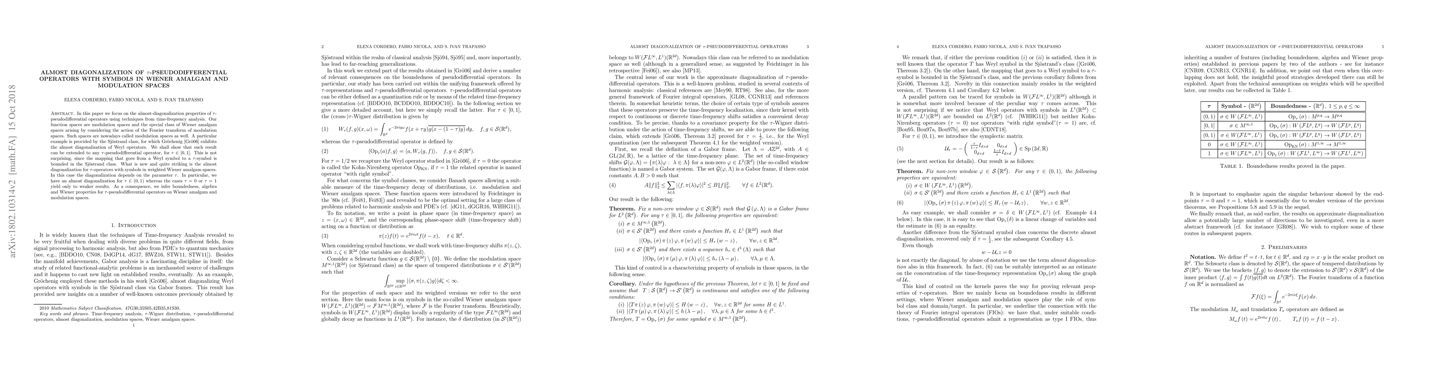 This paper explores the almost-diagonalization properties of $\tau$-pseudodifferential operators using time-frequency analysis techniques. It extends Gr\'ochenig's result for the Sj\'ostrand class to any $\tau$-pseudodifferential operator with symbols in weighted Wiener amalgam spaces, proving boundedness, algebra, and Wiener properties in modulation and Wiener amalgam spaces.