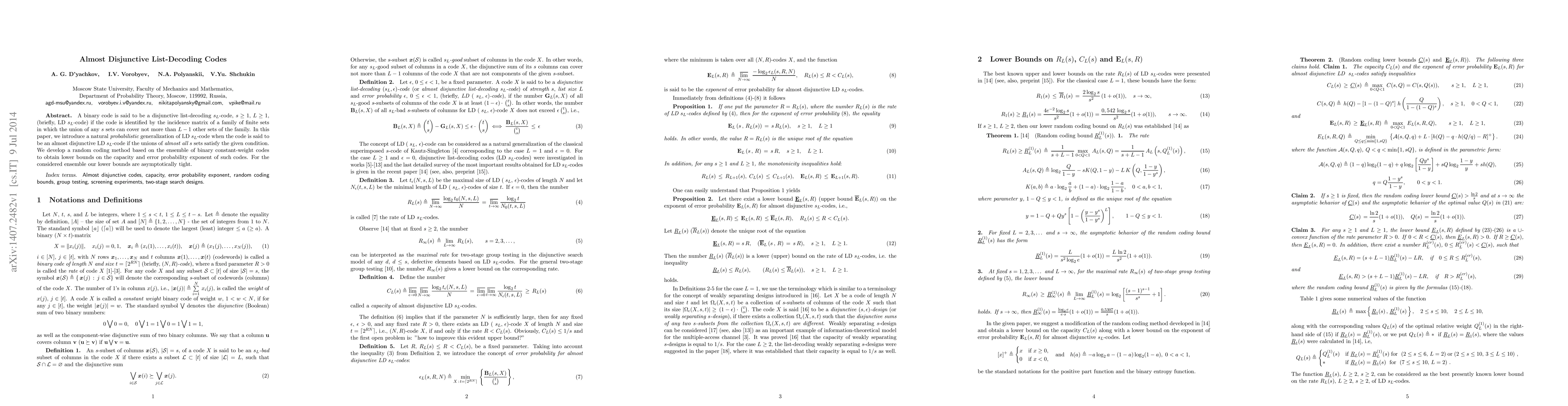 A binary code is said to be a disjunctive list-decoding $s_L$-code, $s\ge1$, $L\ge1$, (briefly, LD $s_L$-code) if the code is identified by the incidence matrix of a family of finite sets in which the union of any $s$ sets can cover not more than $L-1$ other sets of the family. In this paper, we introduce a natural {\em probabilistic} generalization of LD $s_L$-code when the code is said to be an almost disjunctive LD $s_L$-code if the unions of {\em almost all} $s$ sets satisfy the given condition. We develop a random coding method based on the ensemble of binary constant-weight codes to obtain lower bounds on the capacity and error probability exponent of such codes. For the considered ensemble our lower bounds are asymptotically tight.