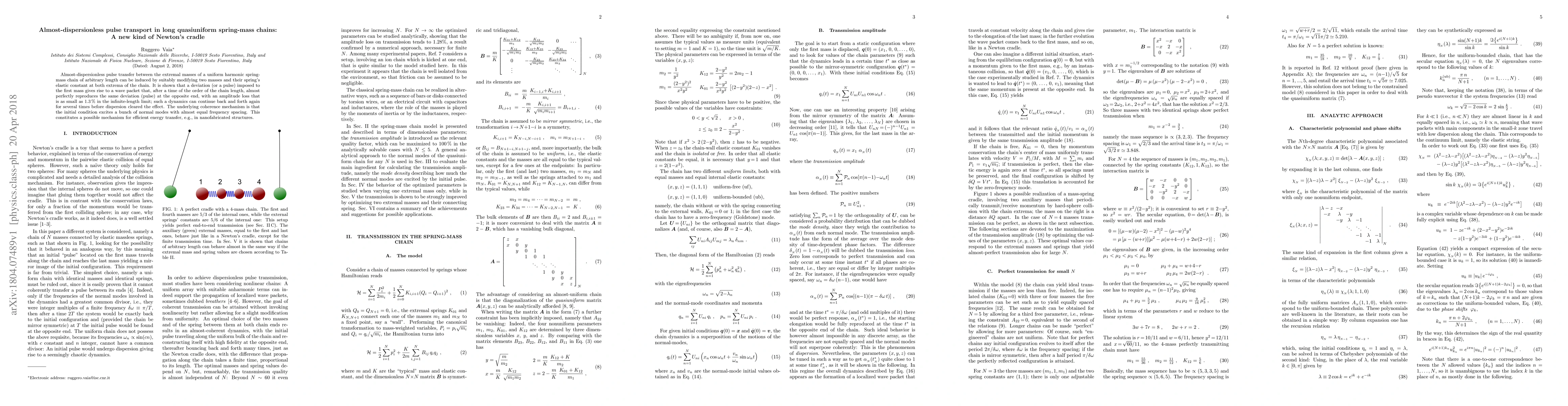 Almost-dispersionless pulse transfer between the extremal masses of a uniform harmonic spring-mass chain of arbitrary length can be induced by suitably modifying two masses and their spring's elastic constant at both extrema of the chain. It is shown that a deviation (or a pulse) imposed to the first mass gives rise to a wave packet that, after a time of the order of the chain length, almost perfectly reproduces the same deviation (pulse) at the opposite end, with an amplitude loss that is as small as 1.3 % in the infinite-length limit; such a dynamics can continue back and forth again for several times before dispersion cleared the effect. The underlying coherence mechanism is that the initial condition excites a bunch of normal modes with almost equal frequency spacing. This constitutes a possible mechanism for efficient energy transfer, e.g., in nanofabricated structures.
