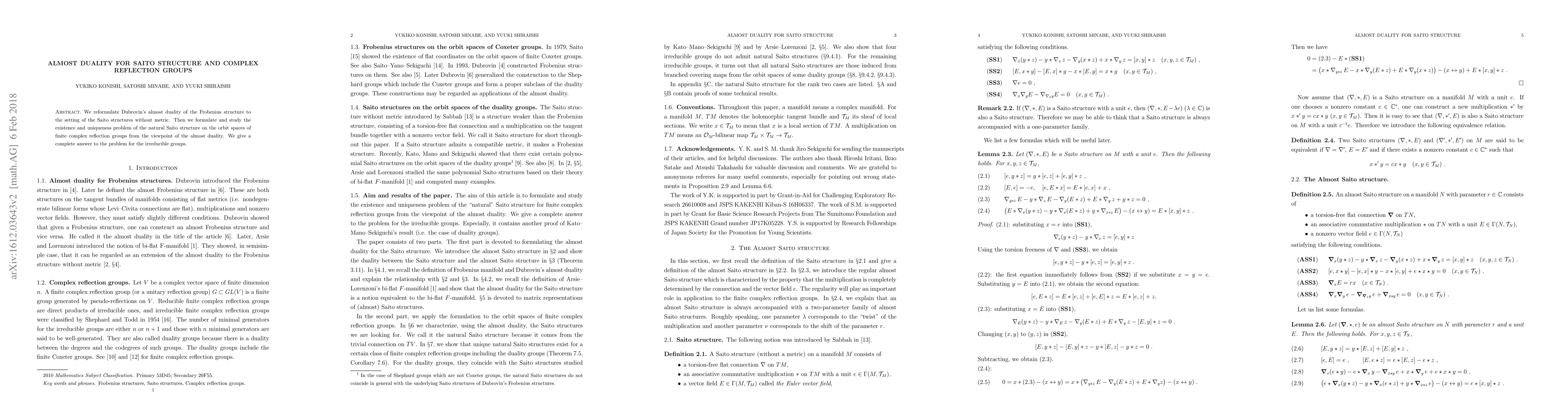 Researchers reformulate Dubrovin's almost duality for Saito structures in finite complex reflection groups, providing a complete answer to the existence and uniqueness problem for irreducible groups.
