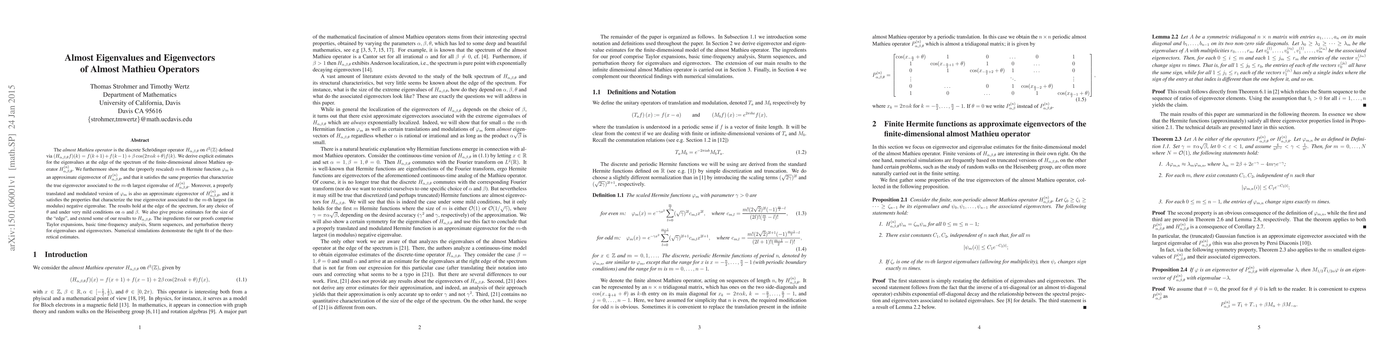 The almost Mathieu operator is the discrete Schr\"odinger operator $H_{\alpha,\beta,\theta}$ on $\ell^2(\mathbb{Z})$ defined via $(H_{\alpha,\beta,\theta}f)(k) = f(k + 1) + f(k - 1) + \beta \cos(2\pi \alpha k + \theta) f(k)$. We derive explicit estimates for the eigenvalues at the edge of the spectrum of the finite-dimensional almost Mathieu operator. We furthermore show that the (properly rescaled) $m$-th Hermite function $\phi_m$ is an approximate eigenvector of this operator, and that it satisfies the same properties that characterize the true eigenvector associated to the $m$-th largest eigenvalue. Moreover, a properly translated and modulated version of $\phi_m$ is also an approximate eigenvector of this operator, and it satisfies the properties that characterize the true eigenvector associated to the $m$-th largest (in modulus) negative eigenvalue. The results hold at the edge of the spectrum, for any choice of $\theta$ and under very mild conditions on $\alpha$ and $\beta$. We also give precise estimates for the size of the "edge", and extend some of our results to the infinite dimensional case. The ingredients for our proofs comprise Taylor expansions, basic time-frequency analysis, Sturm sequences, and perturbation theory for eigenvalues and eigenvectors. Numerical simulations demonstrate the tight fit of the theoretical estimates.