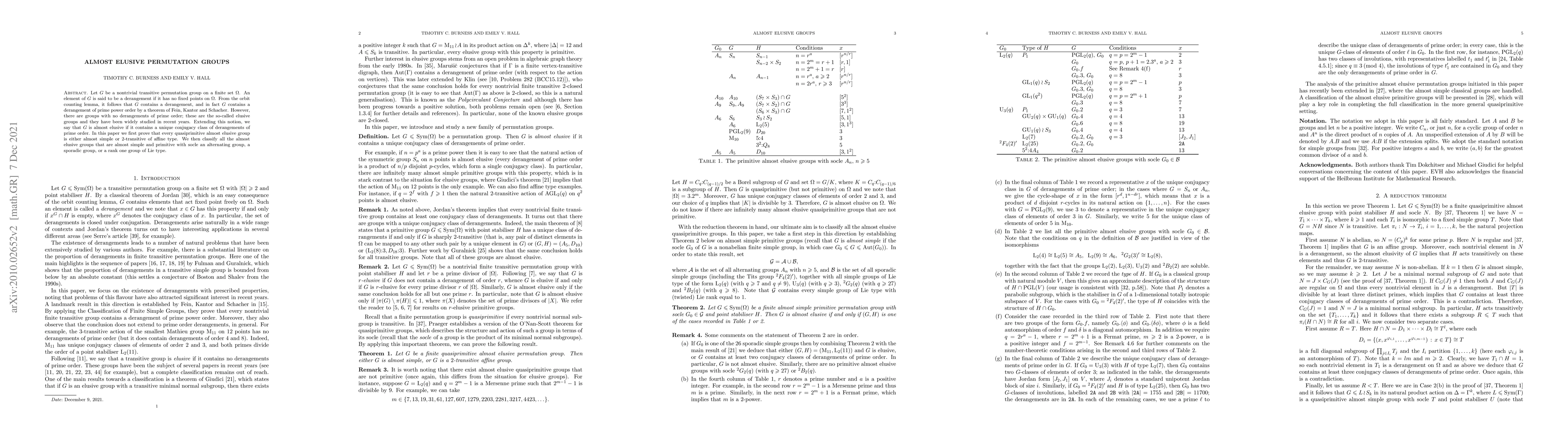 This paper investigates almost elusive permutation groups, which contain a unique conjugacy class of derangements of prime order. It proves that quasiprimitive almost elusive groups are either almost simple or 2-transitive of affine type, and classifies almost elusive groups with socles as alternating, sporadic, or rank one Lie groups.