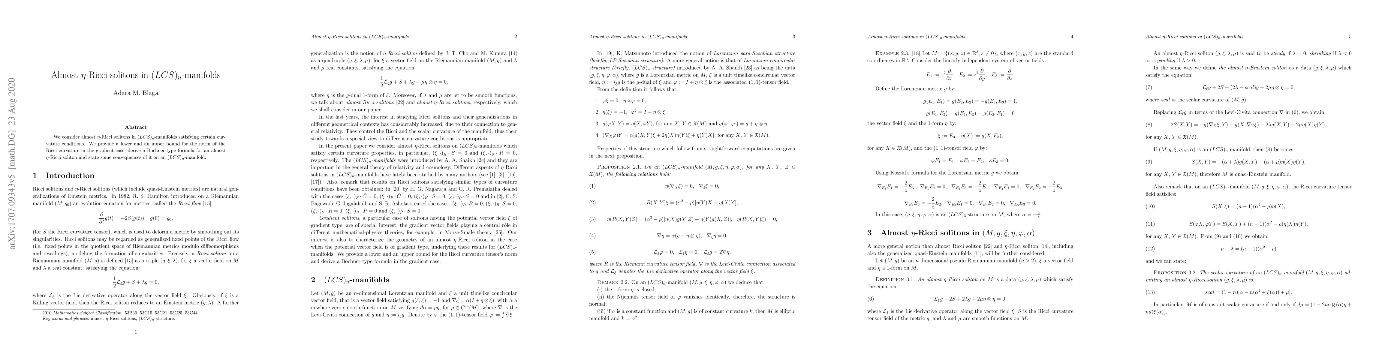 This paper investigates almost $\eta$-Ricci solitons in $(LCS)_n$-manifolds under specific curvature conditions, deriving bounds for the Ricci curvature norm and establishing a Bochner-type formula, with implications for $(LCS)_n$-manifolds.