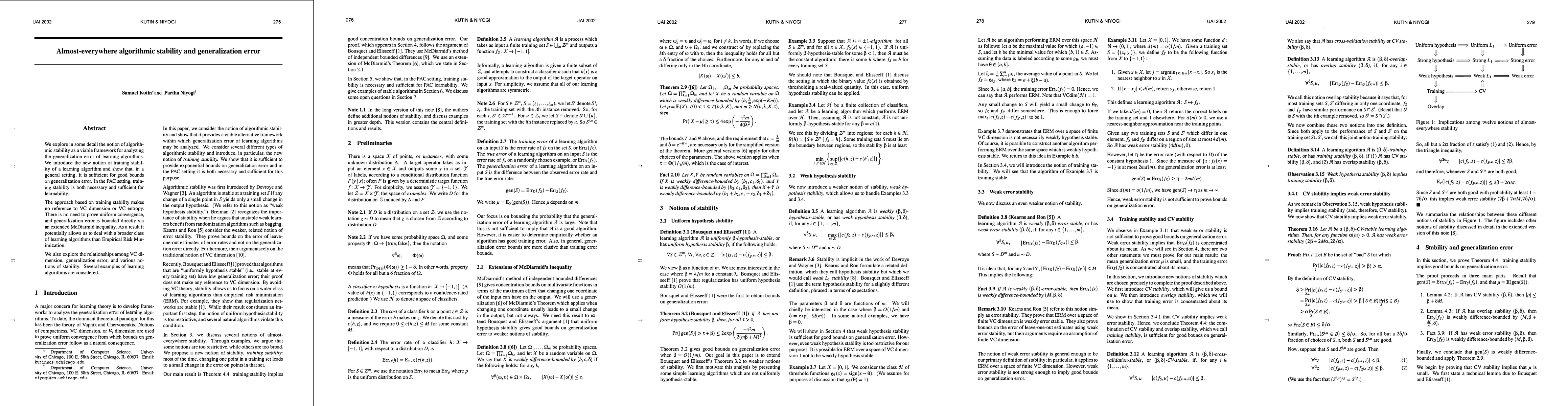We explore in some detail the notion of algorithmic stability as a viable framework for analyzing the generalization error of learning algorithms. We introduce the new notion of training stability of a learning algorithm and show that, in a general setting, it is sufficient for good bounds on generalization error. In the PAC setting, training stability is both necessary and sufficient for learnability.\ The approach based on training stability makes no reference to VC dimension or VC entropy. There is no need to prove uniform convergence, and generalization error is bounded directly via an extended McDiarmid inequality. As a result it potentially allows us to deal with a broader class of learning algorithms than Empirical Risk Minimization. \ We also explore the relationships among VC dimension, generalization error, and various notions of stability. Several examples of learning algorithms are considered.