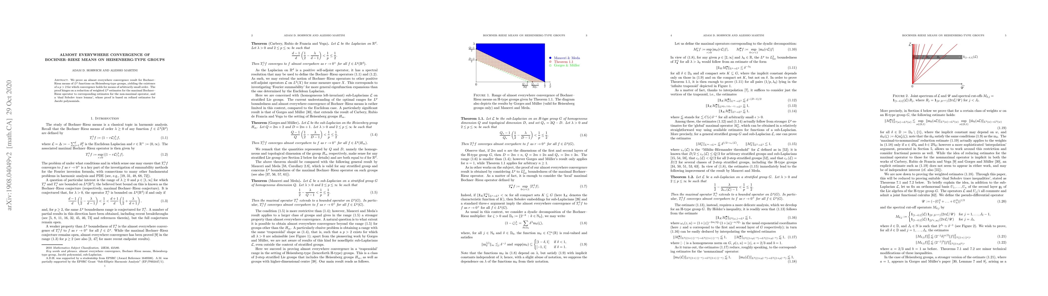 We prove an almost everywhere convergence result for Bochner-Riesz means of $L^p$ functions on Heisenberg-type groups, yielding the existence of a $p>2$ for which convergence holds for means of arbitrarily small order. The proof hinges on a reduction of weighted $L^2$ estimates for the maximal Bochner-Riesz operator to corresponding estimates for the non-maximal operator, and a `dual Sobolev trace lemma', whose proof is based on refined estimates for Jacobi polynomials.