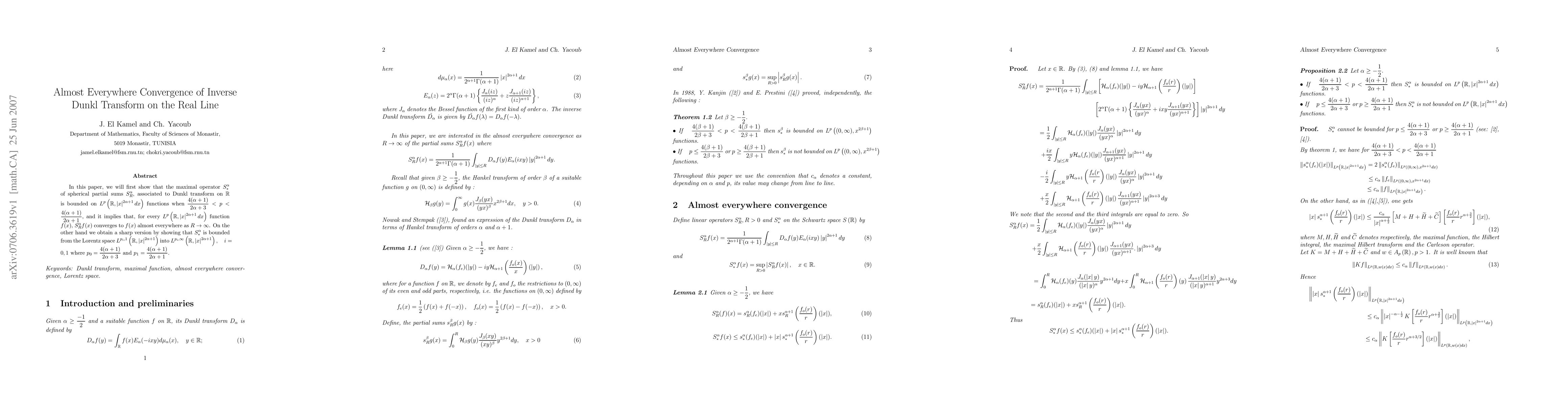 The paper proves that the inverse Dunkl transform converges almost everywhere to the original function on the real line as R approaches infinity, with bounds on the maximal operator for certain ranges of p values.