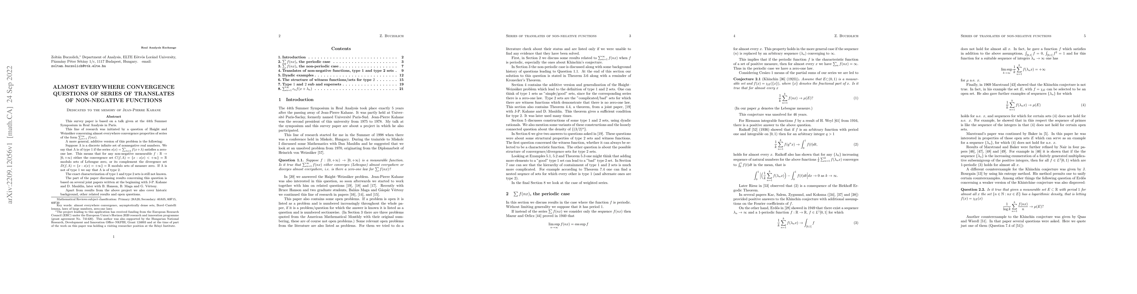 This survey paper explores almost everywhere convergence properties of series of translates of non-negative functions, initiated by Haight and Weizsäcker's question. It investigates discrete sets $\Lambda$ of nonnegative real numbers classified as type 1 or type 2 based on the zero-one law for series $\sum_{\lambda\in\Lambda}f(x+\lambda)$, and discusses the ongoing efforts to characterize these types.