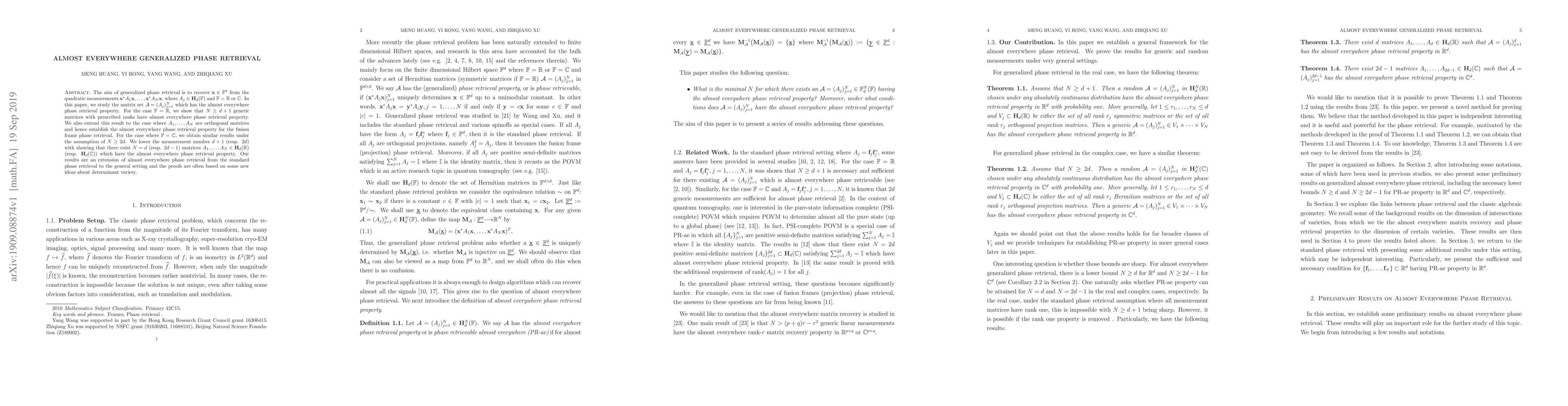 Researchers show that with a minimum of d+1 measurements, it is possible to recover an original signal from quadratic phase retrieval measurements in both real and complex spaces, establishing the 'almost everywhere' phase retrieval property for specific matrix sets.