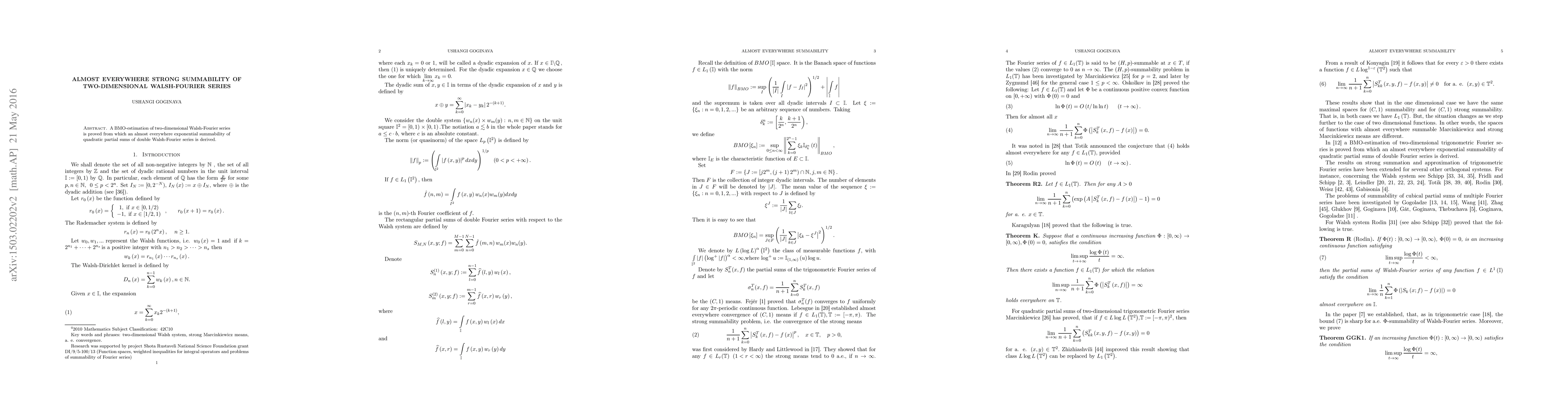 The paper proves a BMO-estimation for quadratic partial sums of two-dimensional Walsh-Fourier series, leading to the conclusion of almost everywhere exponential summability of these partial sums.