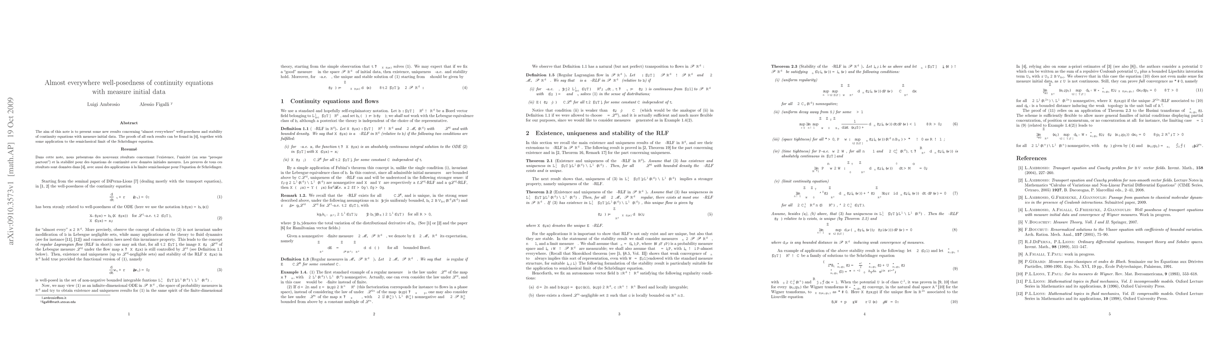 This paper investigates the "almost everywhere" well-posedness and stability of continuity equations starting from measure-valued initial data. The findings include new results and applications to the semiclassical limit of the Schrödinger equation, with detailed proofs provided in \cite{amfifrgi}.