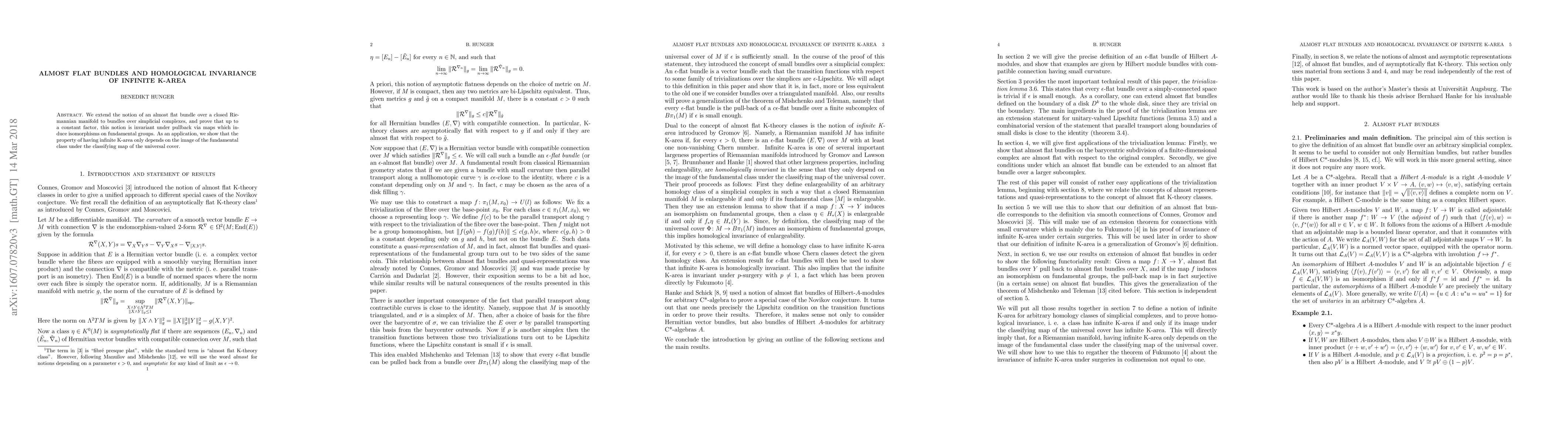 We extend the notion of an almost flat bundle over a closed Riemannian manifold to bundles over simplicial complexes, and prove that up to a constant factor, this notion is invariant under pullback via maps which induce isomorphisms on fundamental groups. As an application, we show that the property of having infinite K-area only depends on the image of the fundamental class under the classifying map of the universal cover.