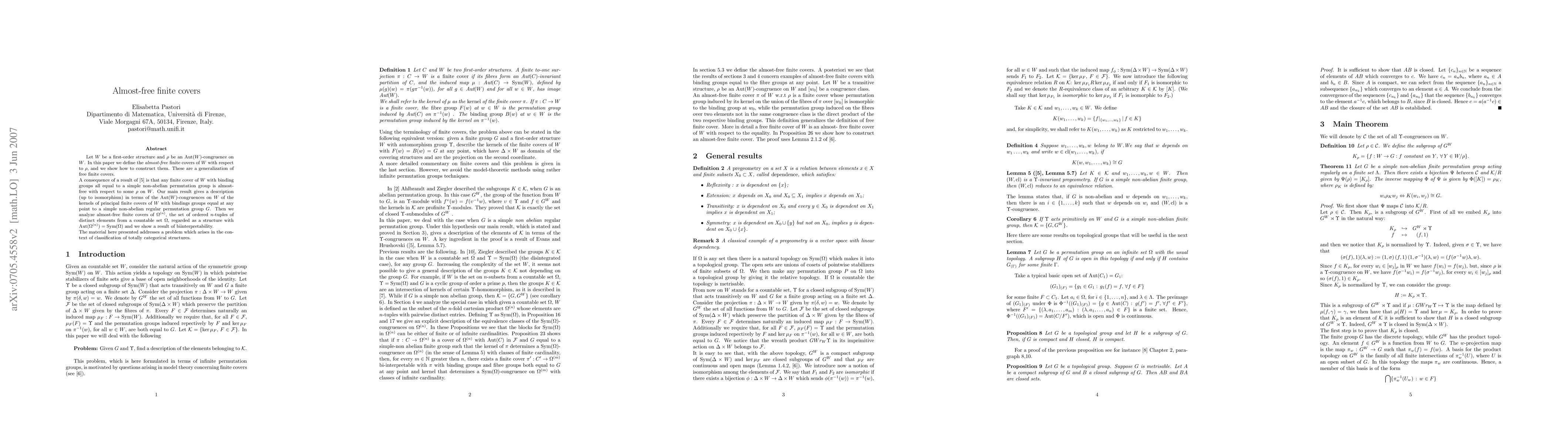 Finite covers are a technique for building new structures from simpler ones. The original motivation to study finite covers is in the Ladder theorem of Zilber which describes how totally categorical structures are built from strictly minimal sets by a sequence of covers. Let W be a first-order structure and r be an Aut(W)-congruence on W. In this paper we define the almost-free finite covers of W with respect to r, and we show how to construct them. These are a generalization of free finite covers. A consequence of a result of Evans and Hrushovski in the paper "On the automorphism groups of finite covers" is that any finite cover of W with binding groups all equal to a simple non-abelian permutation group is almost-free with respect to some r on W. Our main result gives a description (up to isomorphism) in terms of the Aut(W)-congruences on W of the kernels of principal finite covers of W with bindings groups equal at any point to a simple non-abelian regular permutation group G. Then we analyze almost-free finite covers of the set of ordered n-tuples of distinct elements from a countable set Omega, regarded as a structure with automorphism group equal to the Sym(Omega) and we show a result of biinterpretability.