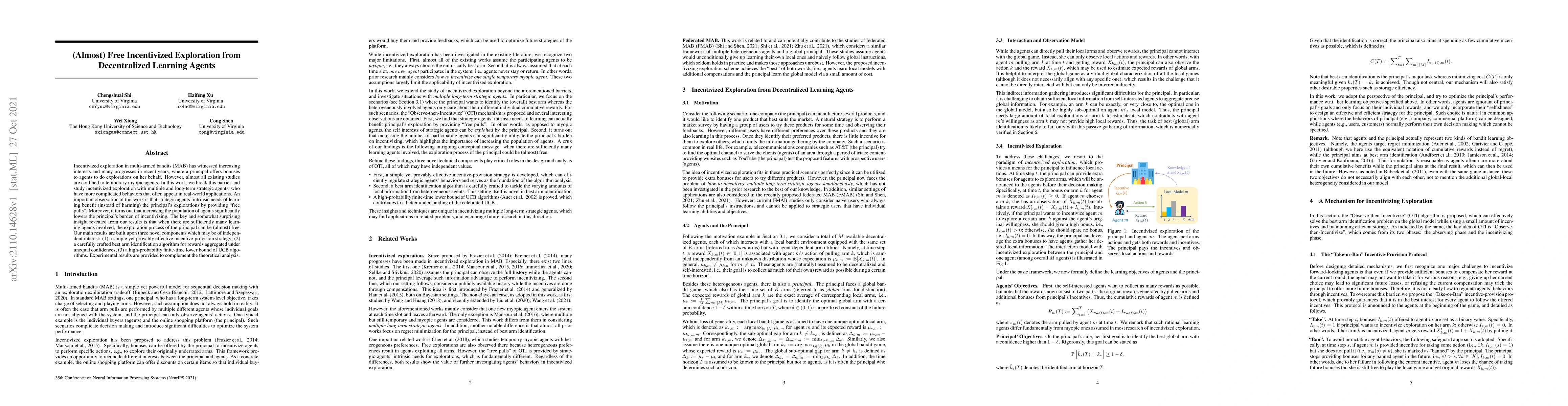 Researchers found that incentivizing strategic agents to explore can lead to nearly free exploration for a principal, reducing their incentive burden. Multiple learning agents can significantly decrease the principal's responsibility.