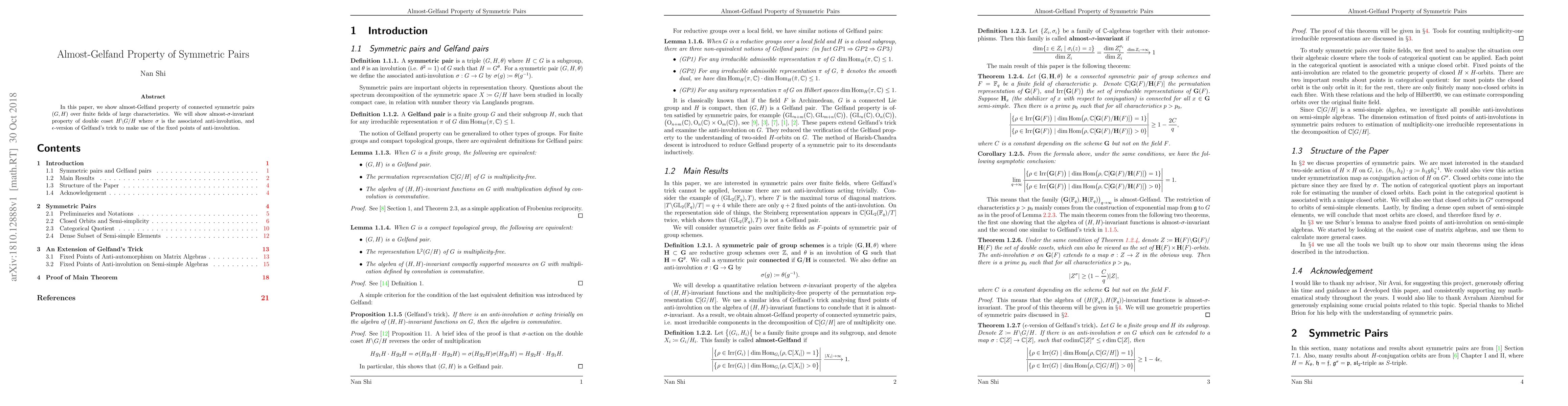 The paper demonstrates the almost-Gelfand property of connected symmetric pairs over finite fields of large characteristics, utilizing the almost-\sigma-invariant property of double coset H\\G/H and an \epsilon-version of Gelfand's trick involving fixed points of anti-involution.