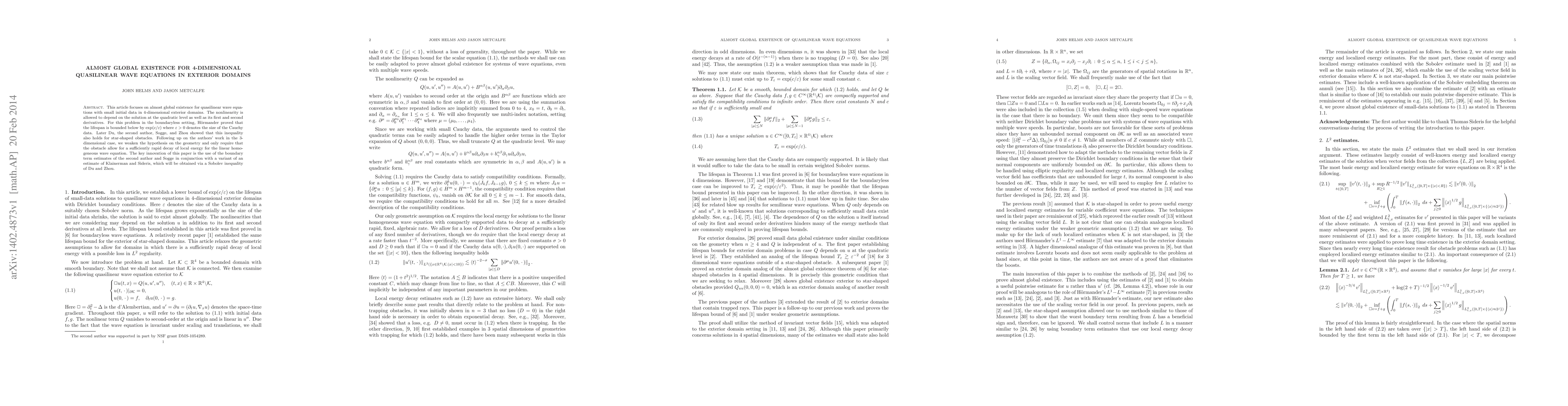 This paper investigates the almost global existence of solutions to quasilinear wave equations in 4-dimensional exterior domains with small initial data, relaxing the geometric constraints compared to previous 3-dimensional studies. The authors utilize boundary term estimates and a variant of a Klainerman-Sideris estimate to achieve their results.