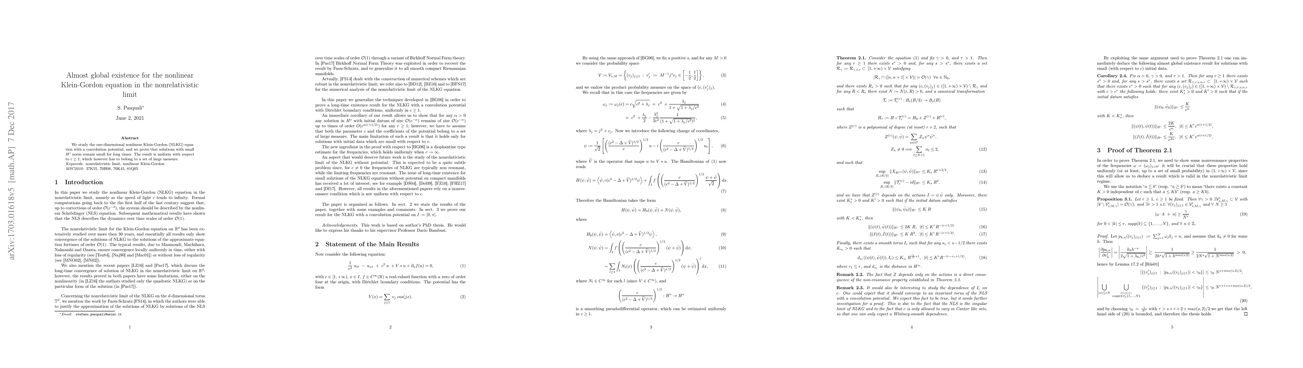 Summary: This paper proves almost global existence for solutions to the one-dimensional nonlinear Klein-Gordon equation with a convolution potential, showing that small initial data remain small for extended periods, uniformly for large values of the speed parameter $c$.