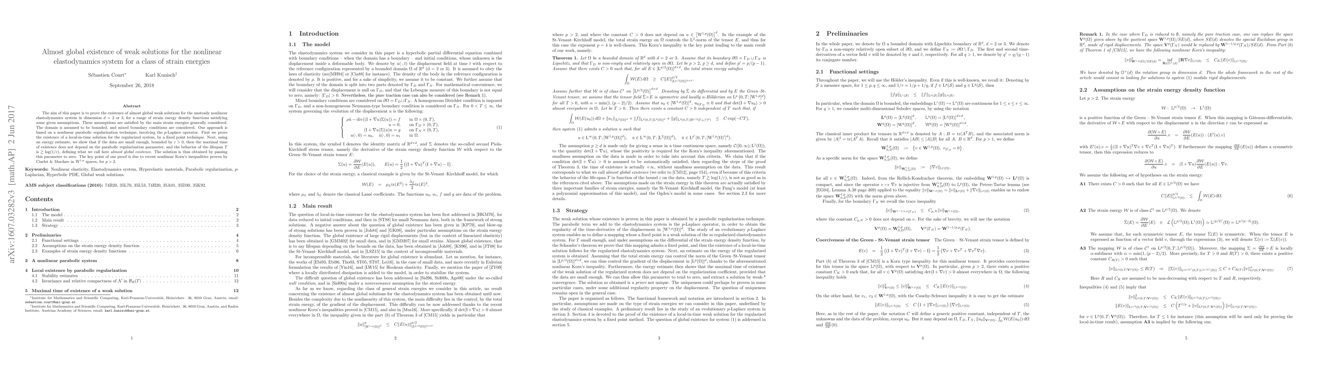 Researchers prove that a non-linear elastodynamics system can have solutions that exist almost globally, meaning they don't disappear even when the regularization parameter approaches zero.