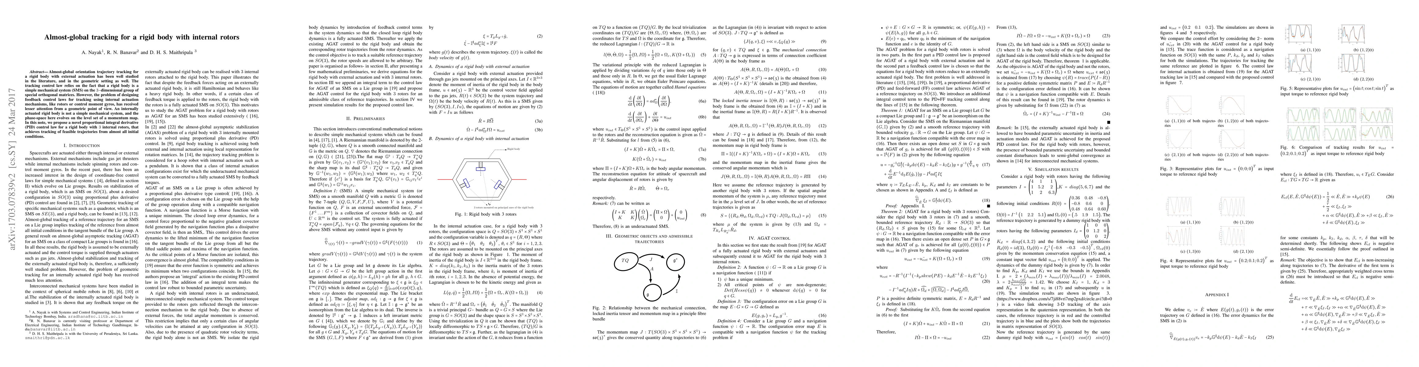 Almost-global orientation trajectory tracking for a rigid body with external actuation has been well studied in the literature, and in the geometric setting as well. The tracking control law relies on the fact that a rigid body is a simple mechanical system (SMS) on the $3-$dimensional group of special orthogonal matrices. However, the problem of designing feedback control laws for tracking using internal actuation mechanisms, like rotors or control moment gyros, has received lesser attention from a geometric point of view. An internally actuated rigid body is not a simple mechanical system, and the phase-space here evolves on the level set of a momentum map. In this note, we propose a novel proportional integral derivative (PID) control law for a rigid body with $3$ internal rotors, that achieves tracking of feasible trajectories from almost all initial conditions.