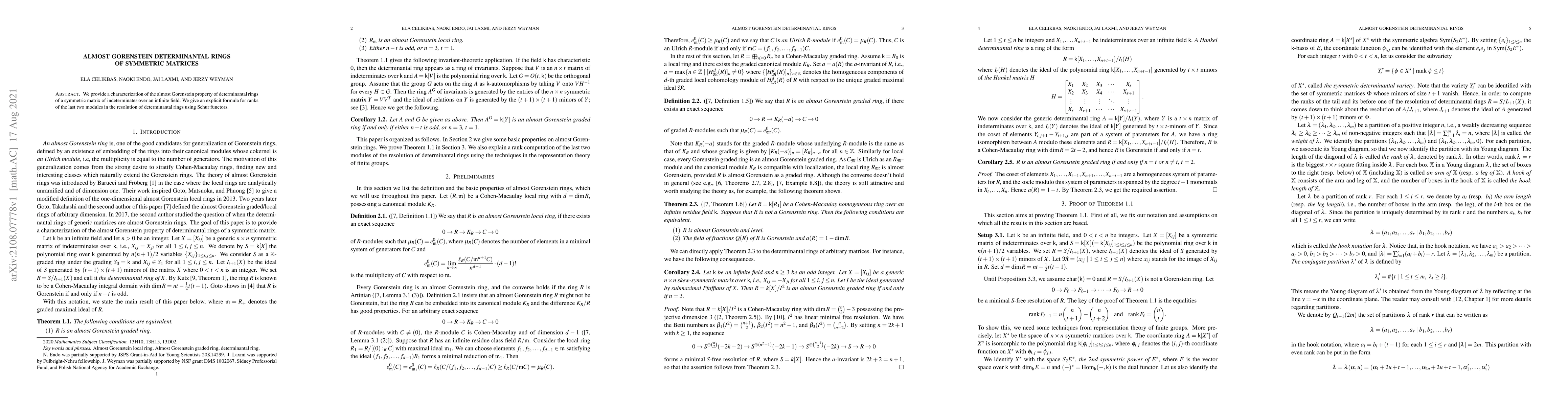 We provide a characterization of the almost Gorenstein property of determinantal rings of a symmetric matrix of indeterminates over an infinite field. We give an explicit formula for ranks of the last two modules in the resolution of determinantal rings using Schur functors.