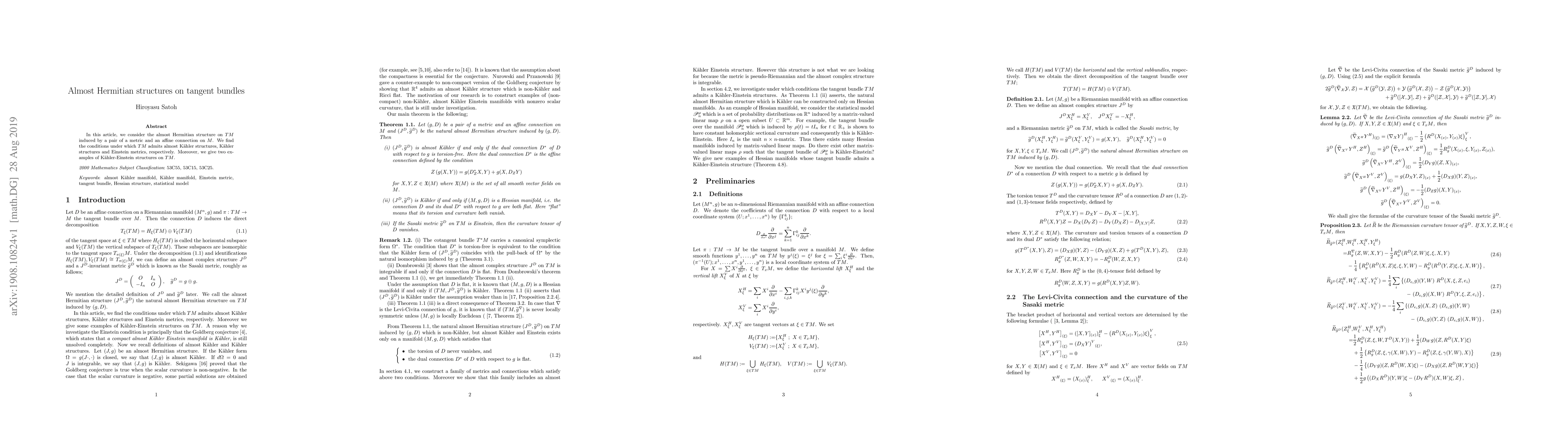 This paper explores the almost Hermitian structures on tangent bundles $TM$ derived from a metric and an affine connection on $M$, identifying conditions for almost Kähler, Kähler, and Einstein structures. It also provides two examples of Kähler-Einstein structures on $TM$.