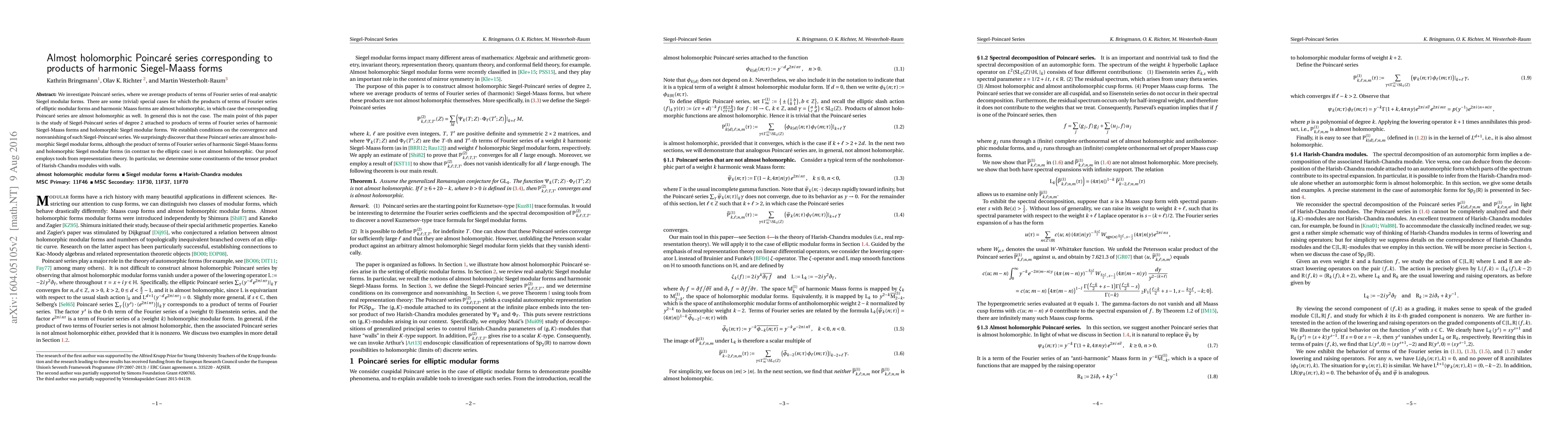 We investigate Poincar\'e series, where we average products of terms of Fourier series of real-analytic Siegel modular forms. There are some (trivial) special cases for which the products of terms of Fourier series of elliptic modular forms and harmonic Maass forms are almost holomorphic, in which case the corresponding Poincar\'e series are almost holomorphic as well. In general this is not the case. The main point of this paper is the study of Siegel-Poincar\'e series of degree $2$ attached to products of terms of Fourier series of harmonic Siegel-Maass forms and holomorphic Siegel modular forms. We establish conditions on the convergence and nonvanishing of such Siegel-Poincar\'e series. We surprisingly discover that these Poincar\'e series are almost holomorphic Siegel modular forms, although the product of terms of Fourier series of harmonic Siegel-Maass forms and holomorphic Siegel modular forms (in contrast to the elliptic case) is not almost holomorphic. Our proof employs tools from representation theory. In particular, we determine some constituents of the tensor product of Harish-Chandra modules with walls.