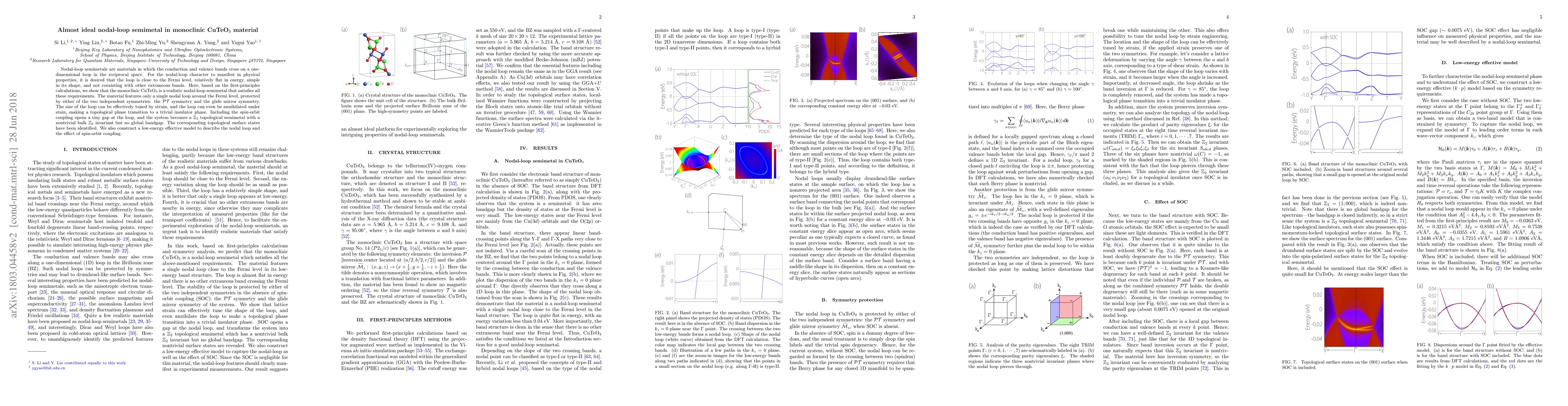 Monoclinic CuTeO$_3$ is identified as an almost ideal nodal-loop semimetal with a single nodal loop around the Fermi level, protected by $\mathcal{PT}$ and glide mirror symmetries. Strain can tune the loop size and induce a topological phase transition to a trivial insulator.