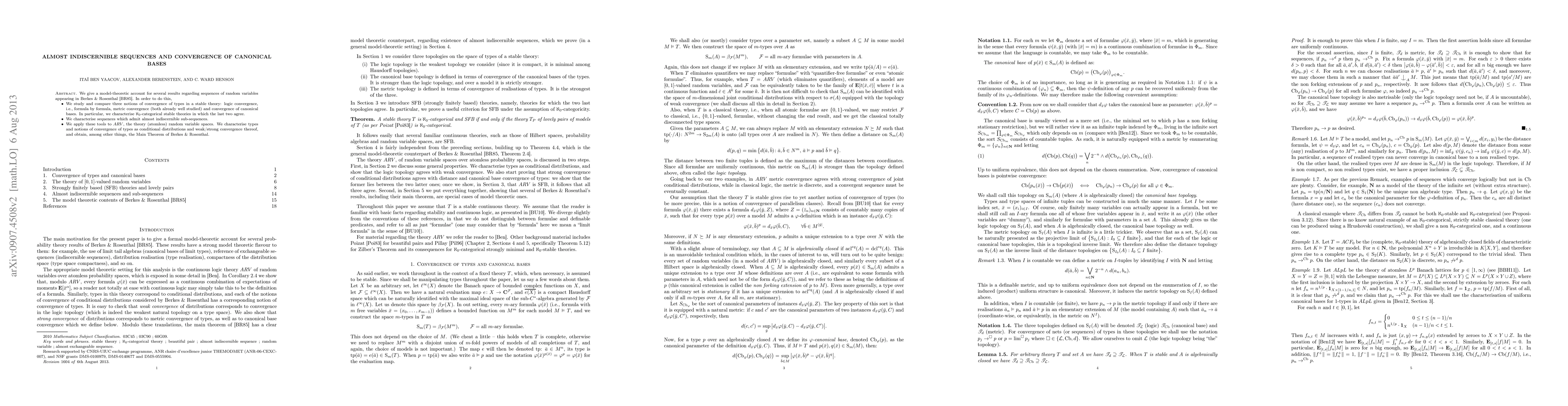 We give a model-theoretic account for several results regarding sequences of random variables appearing in Berkes & Rosenthal \cite{Berkes-Rosenthal:AlmostExchangeableSequences}. In order to do this, {itemize} We study and compare three notions of convergence of types in a stable theory: logic convergence, i.e., formula by formula, metric convergence (both already well studied) and convergence of canonical bases. In particular, we characterise $\aleph_0$-categorical stable theories in which the last two agree. We characterise sequences which admit almost indiscernible sub-sequences. We apply these tools to $ARV$, the theory (atomless) random variable spaces. We characterise types and notions of convergence of types as conditional distributions and weak/strong convergence thereof, and obtain, among other things, the Main Theorem of Berkes & Rosenthal. {itemize}