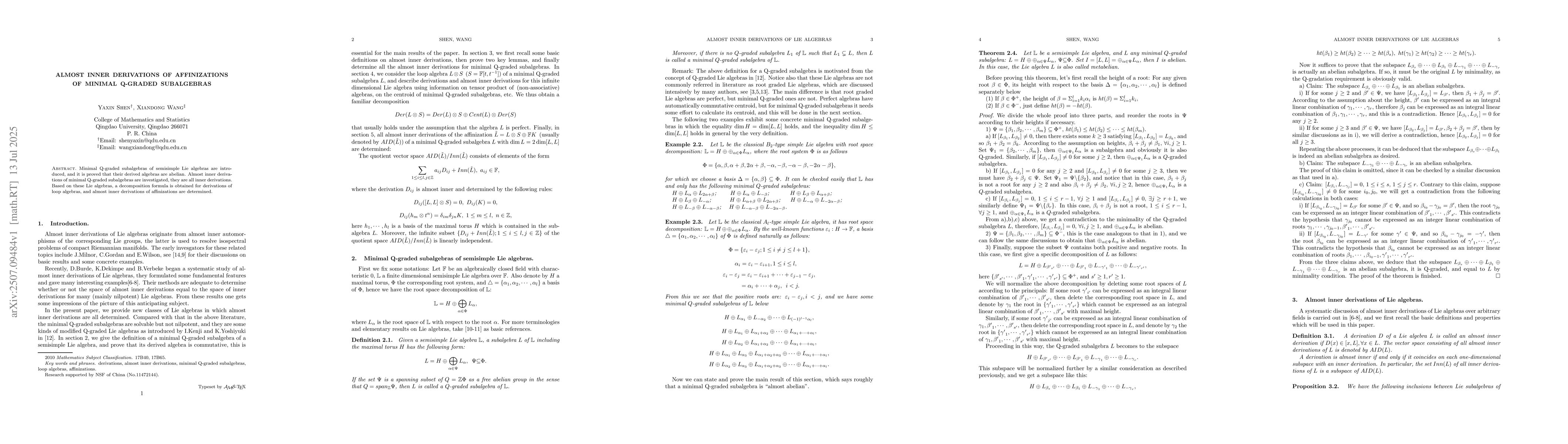Minimal Q-graded subalgebras of semisimple Lie algebras are introduced, and it is proved that their derived algebras are abelian. Almost inner derivations of minimal Q-graded subalgebras are investigated, they are all inner derivations. Based on these Lie algebras, a decomposition formula is obtained for derivations of loop algebras, and almost inner derivations of affinizations are determined.